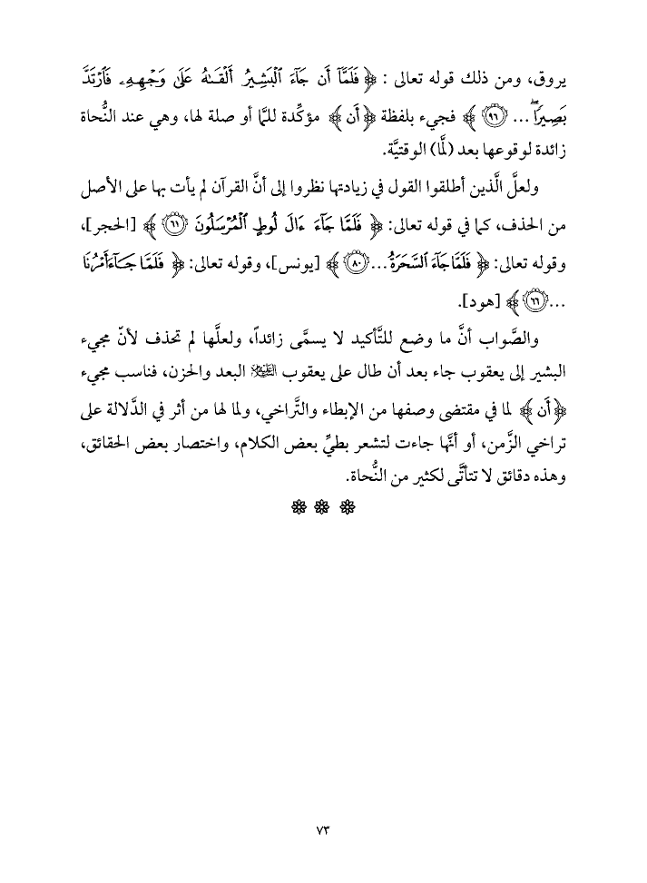 يروق، ومن ذلك قوله تعالى: {فَلَمَّا أَنْ جَاءَ الْبَشِيرُ أَلْقَاهُ عَلَى وَجْهِهِ فَارْتَدَّ بَصِيرًا ... (٩٦)} فجيء بلفظة {أَنْ} مؤكِّدة للمَّا أو صلة لها، وهي عند النُّحاة زائدة لوقوعها بعد (لمَّا) الوقتيَّة.