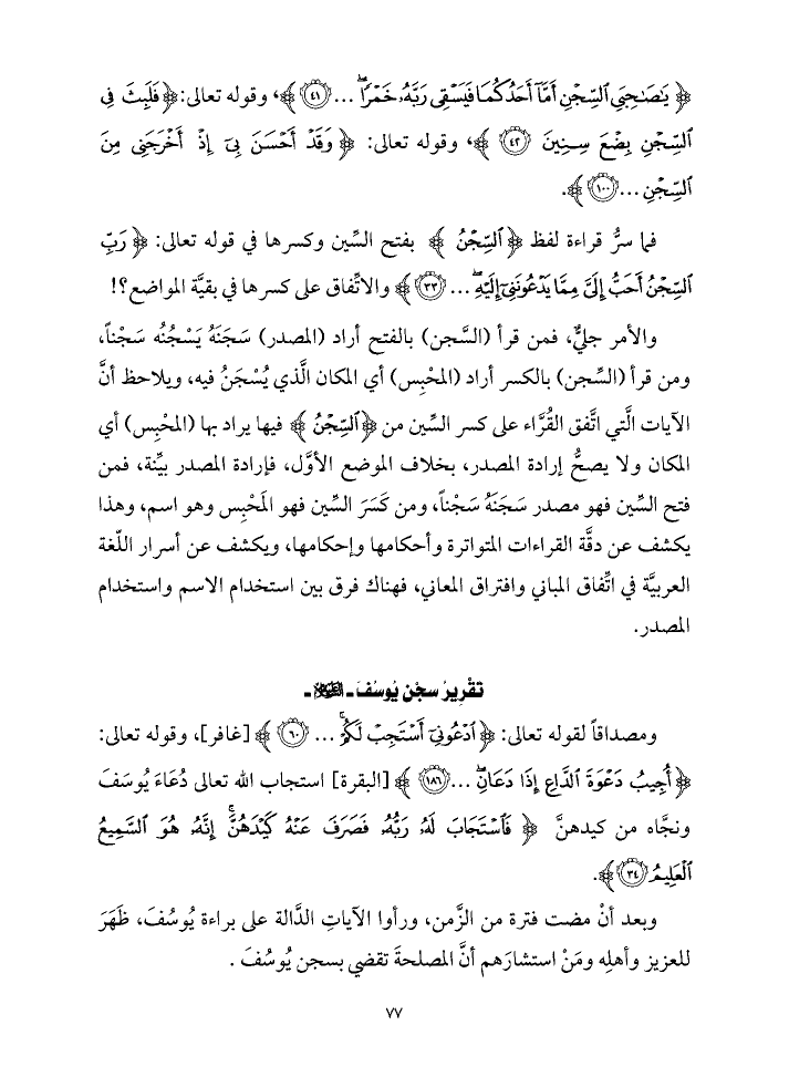 {يَاصَاحِبَيِ السِّجْنِ أَمَّا أَحَدُكُمَا فَيَسْقِي رَبَّهُ خَمْرًا ... (٤١)}، وقوله تعالى: {فَلَبِثَ فِي السِّجْنِ بِضْعَ سِنِينَ (٤٢)}، وقوله تعالى: {وَقَدْ أَحْسَنَ بِي إِذْ أَخْرَجَنِي مِنَ السِّجْنِ ... (١٠٠)}. فما سرُّ قراءة لفظ {السِّجْنُ} بفتح السِّين وكسرها في قوله تعالى: {رَبِّ السِّجْنُ أَحَبُّ إِلَيَّ مِمَّا يَدْعُونَنِي إِلَيْهِ ... (٣٣)} والاتِّفاق على كسرها في بقيَّة المواضع؟!