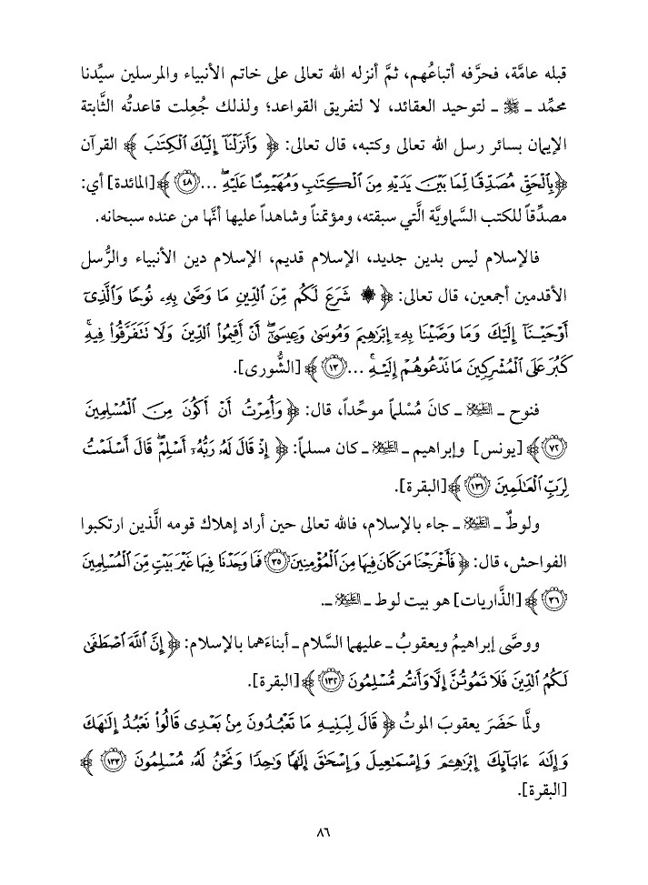 قبله عامَّة، فحرَّفه أتباعُهم، ثمَّ أنزله الله تعالى على خاتم الأنبياء والمرسلين سيِّدنا محمِّد ـ - صلى الله عليه وسلم - ـ لتوحيد العقائد، لا لتفريق القواعد؛ ولذلك جُعِلت قاعدتُه الثَّابتة الإيمان بسائر رسل الله تعالى وكتبه، قال تعالى: {وَأَنْزَلْنَا إِلَيْكَ الْكِتَابَ} القرآن {بِالْحَقِّ مُصَدِّقًا لِمَا بَيْنَ يَدَيْهِ مِنَ الْكِتَابِ وَمُهَيْمِنًا عَلَيْهِ ... (٤٨)} [المائدة] أي: مصدِّقاً للكتب السَّماويَّة الَّتي سبقته، ومؤتمناً وشاهداً عليها أنَّها من عنده سبحانه.
