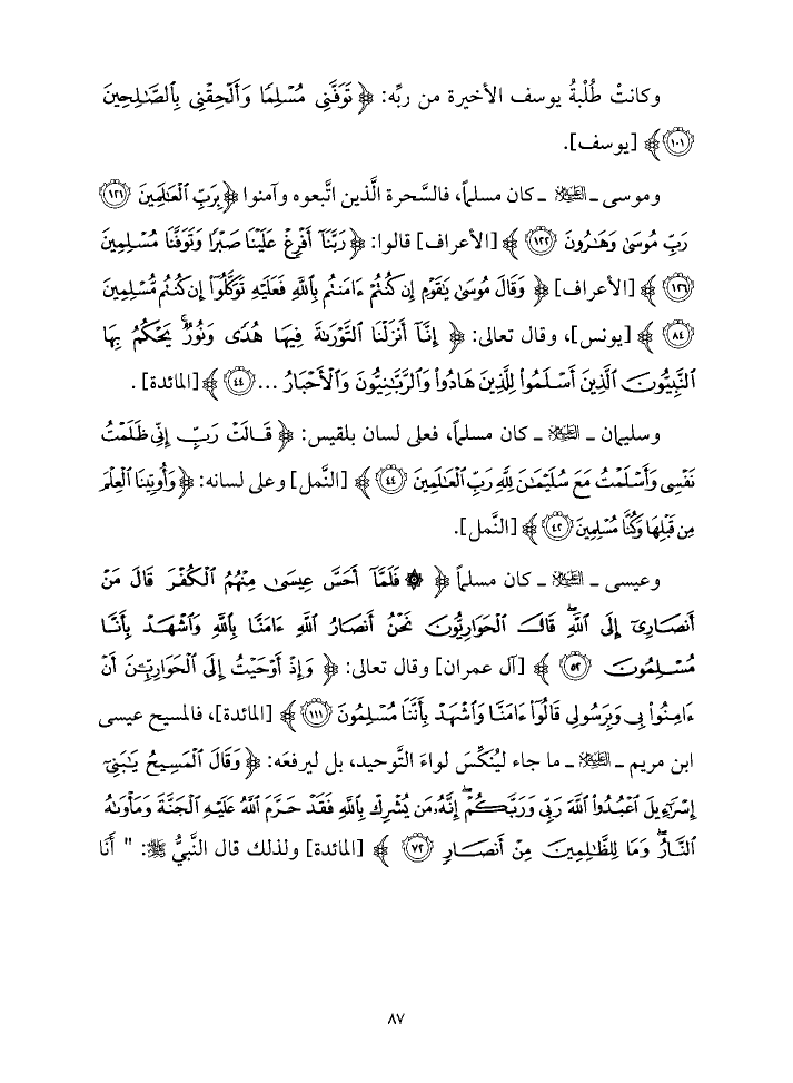 وعيسى ـ - عليه السلام - ـ كان مسلماً {فَلَمَّا أَحَسَّ عِيسَى مِنْهُمُ الْكُفْرَ قَالَ مَنْ أَنْصَارِي إِلَى اللَّهِ قَالَ الْحَوَارِيُّونَ نَحْنُ أَنْصَارُ اللَّهِ آمَنَّا بِاللَّهِ وَاشْهَدْ بِأَنَّا مُسْلِمُونَ (٥٢)} [آل عمران] وقال تعالى: {وَإِذْ أَوْحَيْتُ إِلَى الْحَوَارِيِّينَ أَنْ آمِنُوا بِي وَبِرَسُولِي قَالُوا آمَنَّا وَاشْهَدْ بِأَنَّنَا مُسْلِمُونَ (١١١)} [المائدة]، فالمسيح عيسى ابن مريم ـ - عليه السلام - ـ ما جاء ليُنَكِّسَ لواءَ التَّوحيد، بل ليرفعَه: {وَقَالَ الْمَسِيحُ يَابَنِي إِسْرَائِيلَ اعْبُدُوا اللَّهَ رَبِّي وَرَبَّكُمْ إِنَّهُ مَنْ يُشْرِكْ بِاللَّهِ فَقَدْ حَرَّمَ اللَّهُ عَلَيْهِ الْجَنَّةَ وَمَأْوَاهُ النَّارُ وَمَا لِلظَّالِمِينَ مِنْ أَنْصَارٍ (٧٢)} [المائدة] ولذلك قال النَّبيُّ - صلى الله عليه وسلم -: " أَنَا