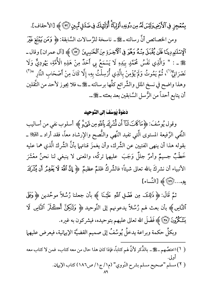 ومن الخصائص أنَّ رسالته ـ - صلى الله عليه وسلم - ـ ناسخة للرِّسالات السَّابقة: {وَمَنْ يَبْتَغِ غَيْرَ الْإِسْلَامِ دِينًا فَلَنْ يُقْبَلَ مِنْهُ وَهُوَ فِي الْآخِرَةِ مِنَ الْخَاسِرِينَ (٨٥)} [آل عمران] وقال ـ - صلى الله عليه وسلم - ـ: " وَالَّذِي نَفْسُ مُحَمَّدٍ بِيَدِهِ لَا يَسْمَعُ بِي أَحَدٌ مِنْ هَذِهِ الْأُمَّةِ، يَهُودِيٌّ وَلَا نَصْرَانِيٌّ (¬١)، ثُمَّ يَمُوتُ وَلَمْ يُؤْمِنْ بِالَّذِي أُرْسِلْتُ بِهِ، إِلَّا كَانَ مِنْ أَصْحَابِ النَّارِ " (¬٢) وهذا واضح في نسخ الملل والشَّرائع كلِّها برسالته ـ - صلى الله عليه وسلم - ـ، فلا يجوز لأحد من الثَّقلين أن يتابع أحداً من الرُّسل السَّابقين بعد بعثته ـ - صلى الله عليه وسلم - ـ.