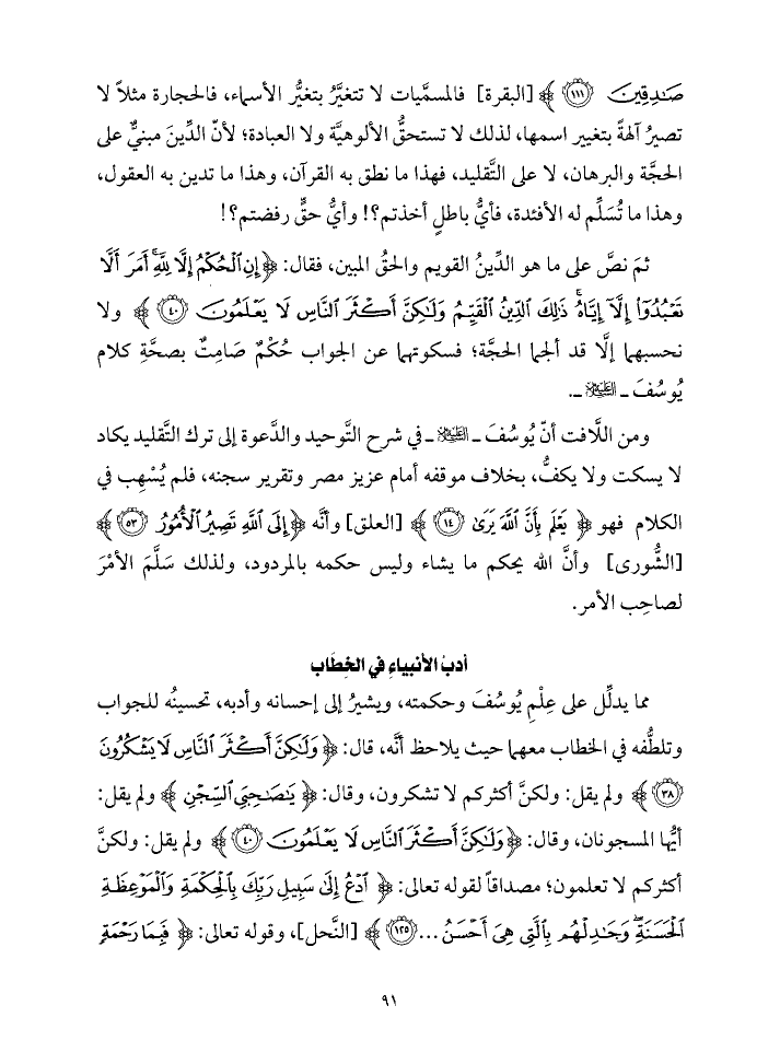 صَادِقِينَ (١١١)} [البقرة] فالمسمَّيات لا تتغيَّرُ بتغيُّر الأسماء، فالحجارة مثلاً لا تصيرُ آلهةً بتغيير اسمها، لذلك لا تستحقُّ الألوهيَّة ولا العبادة؛ لأنّ الدِّينَ مبنيٌّ على الحجَّة والبرهان، لا على التَّقليد، فهذا ما نطق به القرآن، وهذا ما تدين به العقول، وهذا ما تُسَلِّم له الأفئدة، فأيُّ باطلٍ أخذتم؟! وأيُّ حقٍّ رفضتم؟!