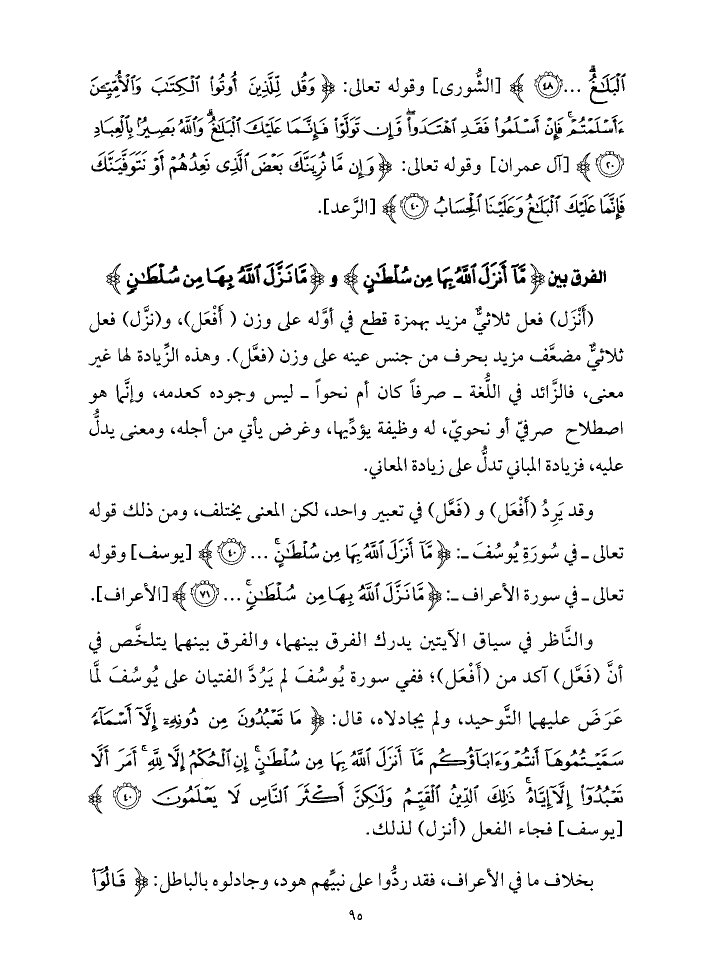الْبَلَاغُ ... (٤٨)} [الشُّورى] وقوله تعالى: {وَقُلْ لِلَّذِينَ أُوتُوا الْكِتَابَ وَالْأُمِّيِّينَ أَأَسْلَمْتُمْ فَإِنْ أَسْلَمُوا فَقَدِ اهْتَدَوْا وَإِنْ تَوَلَّوْا فَإِنَّمَا عَلَيْكَ الْبَلَاغُ وَاللَّهُ بَصِيرٌ بِالْعِبَادِ (٢٠)} [آل عمران] وقوله تعالى: {وَإِنْ مَا نُرِيَنَّكَ بَعْضَ الَّذِي نَعِدُهُمْ أَوْ نَتَوَفَّيَنَّكَ فَإِنَّمَا عَلَيْكَ الْبَلَاغُ وَعَلَيْنَا الْحِسَابُ (٤٠)} [الرَّعد]. الفرق بين {مَا أَنْزَلَ اللَّهُ بِهَا مِنْ سُلْطَانٍ} و {مَا نَزَّلَ اللَّهُ بِهَا مِنْ سُلْطَانٍ}