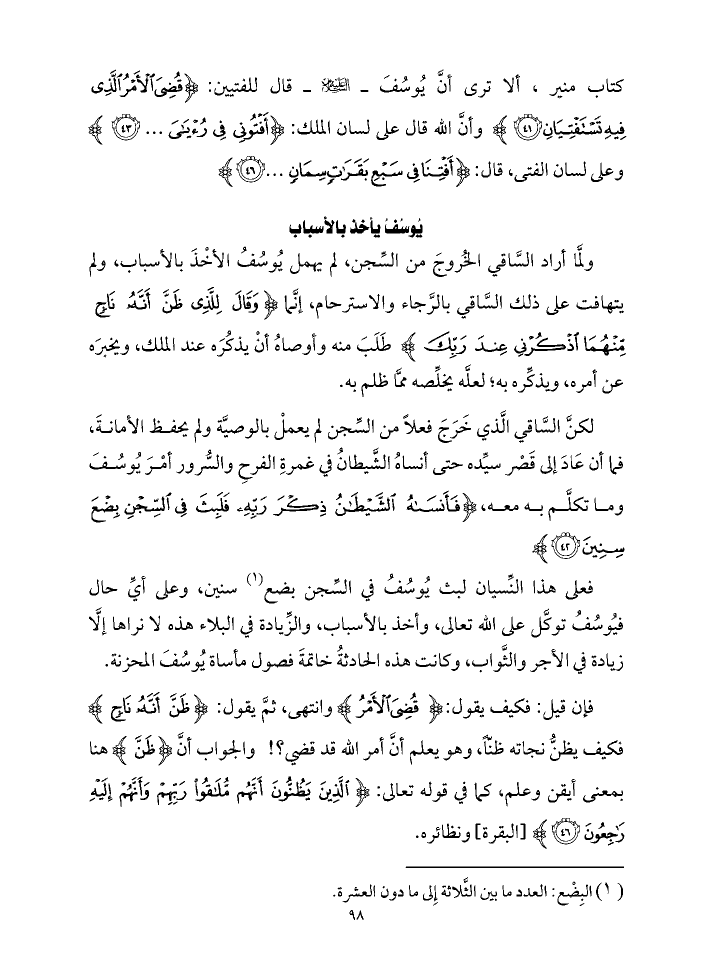 ولمَّا أراد السَّاقي الخُروجَ من السِّجن، لم يهمل يُوسُفُ الأخْذَ بالأسباب، ولم يتهافت على ذلك السَّاقي بالرَّجاء والاسترحام، إنَّما {وَقَالَ ... لِلَّذِي ظَنَّ أَنَّهُ ... نَاجٍ مِنْهُمَا اذْكُرْنِي عِنْدَ رَبِّكَ} طَلَبَ منه وأوصاهُ أنْ يذكُرَه عند الملك، ويخبرَه عن أمره، ويذكِّره به؛ لعلَّه يخلِّصه ممَّا ظلم به.