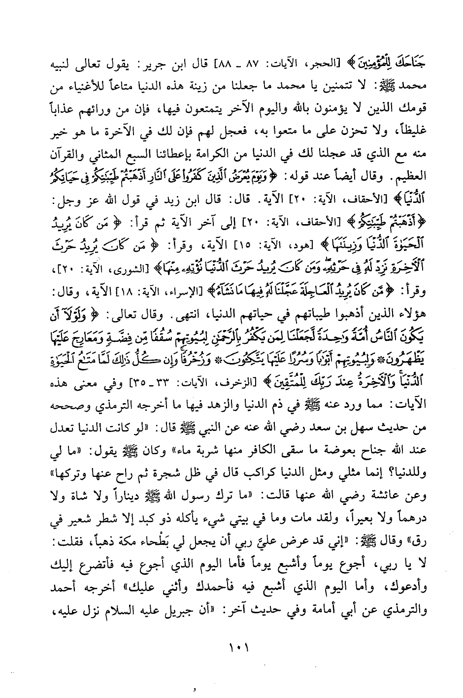 جَنَاحَكَ لِلْمُؤْمِنِينَ} [الحجر، الآيات: 87-88] قال ابن جرير: يقول تعالى لنبيه محمد صلى الله عليه وسلم: لا تتمنين يا محمد ما جعلنا من زينة هذه الدنيا متاعاً للأغنياء من قومك الذين لا يؤمنون بالله واليوم الآخر يتمتعون فيها، فإن من ورائهم عذاباً غليظاً، ولا تحزن على ما متعوا به، فعجل لهم فإن لك في الآخرة ما هو خير منه مع الذي قد عجلنا لك في الدنيا من الكرامة بإعطائنا السبع المثاني والقرآن العظيم. وقال أيضاً عند قوله: {وَيَوْمَ يُعْرَضُ الَّذِينَ كَفَرُوا عَلَى النَّارِ أَذْهَبْتُمْ طَيِّبَاتِكُمْ فِي حَيَاتِكُمُ الدُّنْيَا} [الأحقاف، الآية:20] الآية. قال: قال ابن زيد في قول الله عز وجل: {أَذْهَبْتُمْ طَيِّبَاتِكُمْ} [الأحقاف، الآية:20] إلى آخر الآية ثم قرأ: {مَنْ كَانَ يُرِيدُ الْحَيَاةَ الدُّنْيَا وَزِينَتَهَا} [هود، الآية:15] الآية، وقرأ: {مَنْ كَانَ يُرِيدُ حَرْثَ الْآخِرَةِ نَزِدْ لَهُ فِي حَرْثِهِ وَمَنْ كَانَ يُرِيدُ حَرْثَ الدُّنْيَا نُؤْتِهِ مِنْهَا} [الشورى، الآية:20] ، وقرأ: {مَنْ كَانَ يُرِيدُ الْعَاجِلَةَ عَجَّلْنَا لَهُ فِيهَا مَا نَشَاءُ} [الإسراء، الآية:18] الآية، وقال: هؤلاء الذين أذهبوا طيباتهم في حياتهم الدنيا، انتهى. وقال تعالى: {وَلَوْلا أَنْ يَكُونَ النَّاسُ أُمَّةً وَاحِدَةً لَجَعَلْنَا لِمَنْ يَكْفُرُ بِالرَّحْمَنِ لِبُيُوتِهِمْ سُقُفاً مِنْ فَضَّةٍ وَمَعَارِجَ عَلَيْهَا يَظْهَرُونَ وَلِبُيُوتِهِمْ أَبْوَاباً وَسُرُراً عَلَيْهَا يَتَّكِئُونَ وَزُخْرُفاً وَإِنْ كُلُّ ذَلِكَ لَمَّا مَتَاعُ الْحَيَاةِ الدُّنْيَا وَالآخِرَةُ عِنْدَ رَبِّكَ لِلْمُتَّقِينَ} [الزخرف، الآيات:33-35] وفي معنى هذه الآيات: مما ورد عنه صلى الله عليه وسلم في ذم الدنيا والزهد فيها ما أخرجه الترمذي وصححه من حديث سهل بن سعد رضي الله عنه عن النبي صلى الله عليه وسلم قال: "لو كانت الدنيا تعدل عند الله جناح بعوضة ما سقى الكافر منها شربة ماء" وكان صلى الله عليه وسلم يقول: "مالي وللدنيا؟ إنما مثلي ومثل الدنيا كراكب قال في ظل شجرة ثم راح عنها وتركها" وعن عائشة رضي الله عنها قالت: "ما ترك رسول الله صلى الله عليه وسلم ديناراً ولا شاة ولا درهماً ولا بعيراً، ولقد مات وما في بيته شيء يأكله ذو كبد إلا شطر شعير في رق" وقال صلى الله عليه وسلم: "إني قد عرض علي ربي أن يجعل لي بطحاء مكة ذهباً، فقلت: لا يا ربي، أجوع يوماً وأشبع يوماً فأما اليوم الذي أجوع فيه فأتضرع إليك وأدعوك، وأما اليوم الذي اشبع فيها فأحمدك وأثني عليك" أخرجه أحمد والترمذي عن أبي أمامه وفي حديث آخر: "أن جبريل عليه السلام نزل عليه،