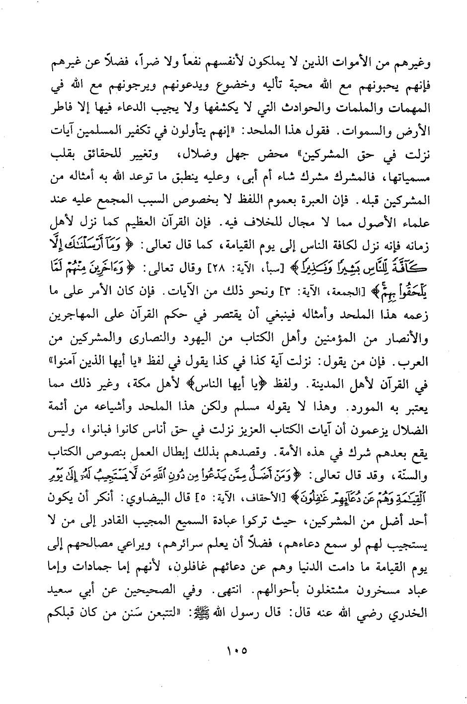 وغيرهم من الأموات الذين لا يملكون لأنفسهم نفعاً ولا ضراً، فضلاً عن غيرهم فإنهم يحبونهم مع الله محبة تأليه وخضوع ويدعونهم ويرجونهم مع الله في المهمات والملمات والحوادث التي لا يكشفها ولا يجيب الدعاء فيها إلا فاطر الأرض والسموات. فقول هذا الملحد: "إنهم يتأولون في تكفير المسلمين آيات نزلت في حق المشركين" محض جهل وضلال، وتغيير للحقائق بقلب مسمياتها، فالمشرك مشرك شاء أم أبى، وعليه ينطبق ما توعد الله به أمثاله من المشركين قبله. فإن العبرة بعموم اللفظ لا بخصوص السبب المجمع عليه عند علماء الأصول مما لا مجال للخلاف فيه. فإن القرآن العظيم كما نزل لأهل زمانه فإنه نزل لكافة الناس إلى يوم القيامة، كما قال تعالى: {وَمَا أَرْسَلْنَاكَ إِلَّا كَافَّةً لِلنَّاسِ بَشِيراً وَنَذِيراً} [سبأ، الآية:28] وقال تعالى: {وَآخَرِينَ مِنْهُمْ لَمَّا يَلْحَقُوا بِهِمْ} [الجمعة، الآية:3] ونحو ذلك من الآيات. فإن كان الأمر على ما زعمه هذا الملحد وأمثاله فينبغي أن يقتصر في حكم القرآن على المهاجرين والأنصار من المؤمنين وأهل الكتاب واليهود والنصارى والمشركين من العرب. فإن من يقول: نزلت آية كذا في كذا يقول في لفظ "يا أيها الذين آمنوا" في القرآن لأهل المدينة. ولفظ "يا أيها الناس" لأهل مكة، وغير ذلك مما يعتبر به المورد. وهذا لا يقوله مسلم ولكن هذا الملحد وأشياعه من أئمة الضلال يزعمون أن آيات الكتاب العزيز نزلت في حق أناس كانوا فبانوا، وليس يقع بعدهم شرك في هذه الأمة. وقصدهم بذلك إبطال العمل بنصوص الكتاب والسنة، وقد قال تعالى: {وَمَنْ أَضَلُّ مِمَّنْ يَدْعُو مِنْ دُونِ اللَّهِ مَنْ لا يَسْتَجِيبُ لَهُ إِلَى يَوْمِ الْقِيَامَةِ وَهُمْ عَنْ دُعَائِهِمْ غَافِلُونَ} [الأحقاف، الآية:5] قال البيضاوي: أنكر أن يكون أحد أضل من المشركين، حيث تركوا عبادة السميع المجيب القادر إلى من لا يستجيب لهم لو سمع دعاءهم، فضلاً أن يعلم سرائرهم، ويراعي مصالحهم إلى يوم القيامة ما دامت الدنيا وهم عن دعائهم غافلون، لأنهم إما جمادات وإما عباد مسخرون مشتغلون بأحوالهم. انتهى. وفي الصحيحين عن أبي سعيد الخدري رضي الله عنه قال: قال رسول الله صلى الله عليه وسلم: "لتتبعن سنن من كان قبلكم