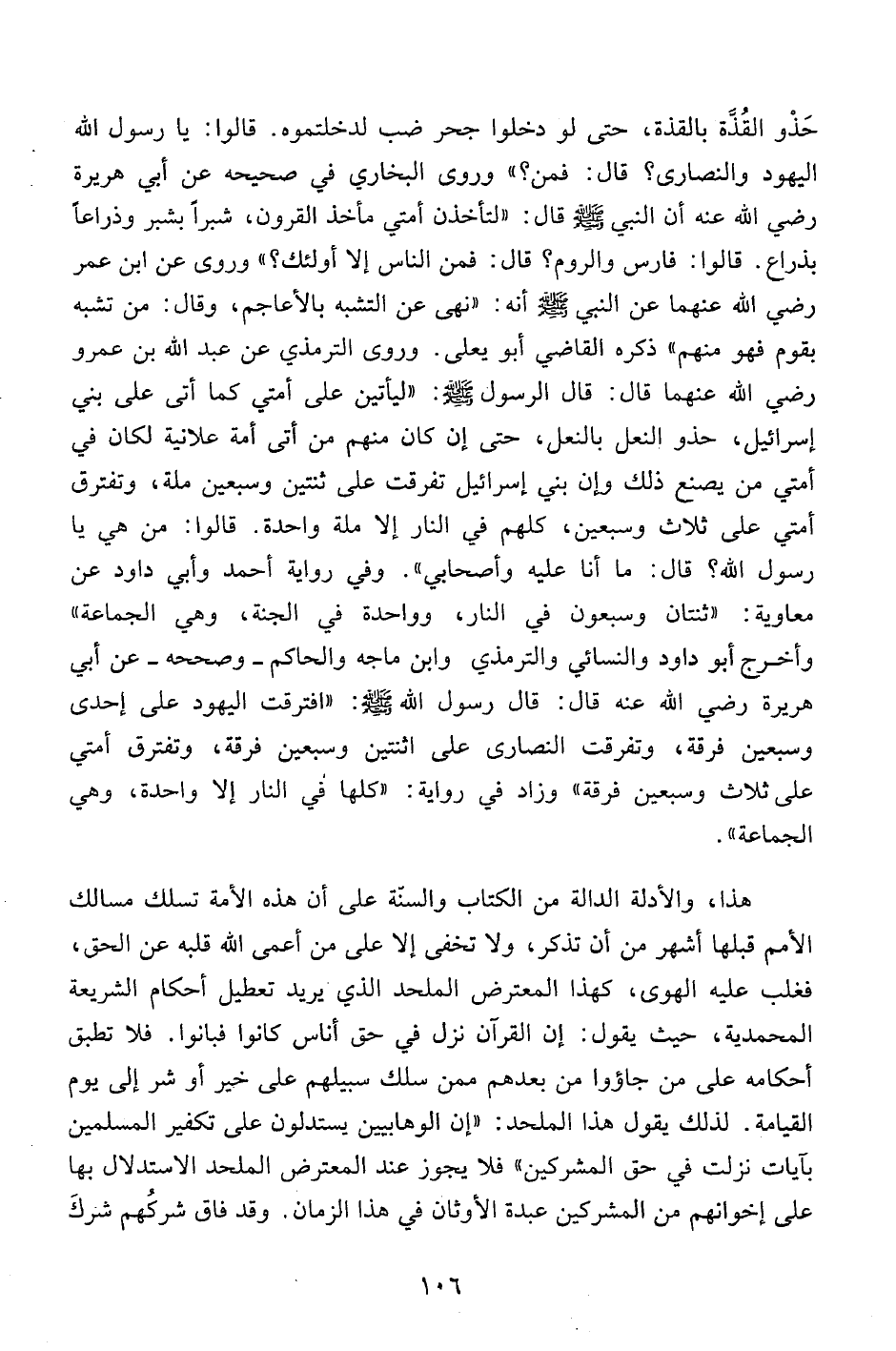 حذو القذة بالقذة، حتى لو دخلوا جحر ضب لدخلتموه. قالوا: يا رسول الله اليهود والنصارى؟ قال: فمن؟ " وروى البخاري في صحيحه عن أبي هريرة رضي الله عنه أن النبي صلى الله عليه وسلم قال: "لتأخذن أمتي مأخذ القرون، شبراً بشبر وذرعاً بذراع. قالوا: فارس والروم؟ قال: فمن الناس إلا إولئك؟ " وروى عن ابن عمر رضي الله عنهما عن النبي صلى الله عليه وسلم أنه: "نهى عن التشبه بالأعاجم، وقال: من تشبه بقوم فهو منهم" ذكره القاضي أبو يعلى. وروى الترمذي عن عبد الله بن عمرو رضي الله عنهما قال: قال رسول الله صلى الله عليه وسلم: "ليأتين على أمتي كما أتى على بني إسرائيل، حذو النعل بالنعل، حتى إن كان منهم من أتى أمة علانية لكان في أمتي من يصنع ذلك وإن بني إسرائيل تفرقت على ثنتين وسبعين ملة، وتفترق أمتى على ثلاث وسبعين، كلهم في النار إلا ملة واحدة. قالوا: من هي يا رسول الله؟ قال: ما أنا عليه وأصحابي". وفي رواية أحمد وأبي داود عن معاوية: "ثنتان وسبعون في النار، وواحدة في الجنة، وهي الجماعة" وأخرج أبو داود والنسائي والترمذي وابن ماجه والحاكم – وصححه – عن أبي هريرة رضي الله عنه قال: قال رسول الله صلى الله عليه وسلم: "افترقت اليهود على إحدى وسبعين فرقة، وتفرقت النصارى على اثنتين وسبعين فرقة، وتفترق أمتي على ثال وسبعين فرقة" وزاد في رواية: "كلها في النار إلا واحدة، وهي الجماعة".