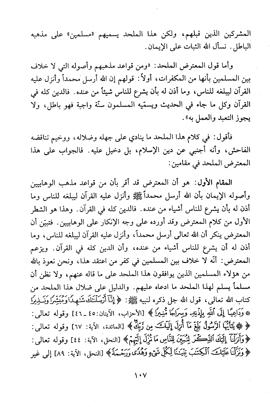 المقام الأول: هو أن المعترض قد أقر بأن من قواعد مذهب الوهابيين وأصوله الإيمان بأن الله أرسل محمداً صلى الله عليه وسلم وأنزل عليه القرآن ليبلغه للناس وما أذن له بأن يشرع للناس أشياء من عنده. فالدين كله في القرآن. وهذا هو الشطر الأول من كلام المعترض وقد أورده على وجه الإنكار على الوهابيين. فتبين أن المعترض ينكر أن الله تعالى أرسل محمداً، وأنزل عليه القرآن ليبلغه للناس، وما أذن له أن يشرع للناس أشياء من عنده، وأن الدين كله في القرآن. ويزعم المعترض: أنه لا خلاف بين المسلمين في كفر من اعتقد هذا، ونحن نعوذ بالله من هؤلاء المسلمين الذين يوافقون هذا الملحد على ما قاله عنهم، ولا نظن أن مسلماً يسلم لهذا الملحد ما ادعاه عليهم. والدليل على ضلال هذا الملحد من كتاب الله تعالى، قول الله جل ذكره لنبيه صلى الله عليه وسلم: {إِنَّا أَرْسَلْنَاكَ شَاهِداً وَمُبَشِّراً وَنَذِيراً وَدَاعِياً إِلَى اللَّهِ بِإِذْنِهِ وَسِرَاجاً مُنِيرا} [الأحزاب، الآيتان:45-46] وقوله تعالى: {يَا أَيُّهَا الرَّسُولُ بَلِّغْ مَا أُنْزِلَ إِلَيْكَ مِنْ رَبِّكَ} [المائدة، الآية: 67] وقوله تعالى: {وَأَنْزَلْنَا إِلَيْكَ الذِّكْرَ لِتُبَيِّنَ لِلنَّاسِ مَا نُزِّلَ إِلَيْهِمْ} [النحل، الآية:44] وقوله تعالى: {وَنَزَّلْنَا عَلَيْكَ الْكِتَابَ تِبْيَاناً لِكُلِّ شَيْءٍ وَهُدىً وَرَحْمَةً} [النحل: الآية:89] إلى غير