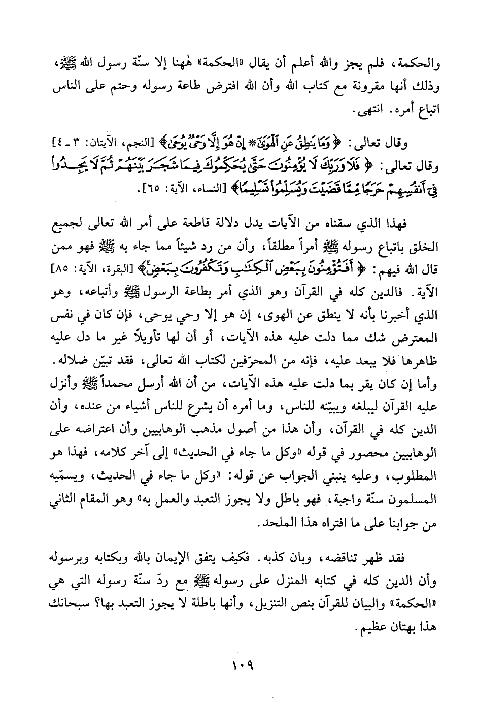 فهذا الذي سقناه من الآيات يدل دلالة قاطعة على أمر الله تعالى لجميع الخلق باتباع رسوله صلى الله عليه وسلم أمراً مطلقاً، وأن من رد شيئاً مما جاء به صلى الله عليه وسلم فهو ممن قال الله فيهم: {أَفَتُؤْمِنُونَ بِبَعْضِ الْكِتَابِ وَتَكْفُرُونَ بِبَعْضٍ} [البقرة، الآية: 85] الآية. فالدين كله في القرآن وهو الذي أمر بطاعة الرسول صلى الله عليه وسلم وأتباعه، وهو الذي أخبرنا بأنه لا ينطق عن الهوى، إن هو إلا وحي يوحى، فإن كان في نفس المعترض شك مما دلت عليه هذه الآيات، أو أن لها تأويلاً غير ما دل عليه ظاهرها فلا يبعد عليه، فإنه من المحرفين لكتاب الله تعالى، فقد تبين ضلاله. وأما أن كان يقر بما دلت عليه هذه الآيات، من أن الله أرسل محمداً صلى الله عليه وسلم وأنزل عليه القرآن ليبلغه ويبينه للناس، وما أمره أن يشرع للناس أشياء من عنده، وأنا الدين كله في القرآن، وأن هذا من أصول مذهب الوهابيين وأن اعتراضه على الوهابيين محصور في قوله "وكل ما جاء في الحديث" إلى آخر كلامه، فهذا هو المطلوب، وعليه ينبني الجواب عن قوله: "وكل ما جاء في الحديث، ويسميه المسلمون سنة واجبة، فهو باطل ولا يجوز التعبد والعمل به " وهو المقام الثاني من جوابنا على ما افتراه هذا الملحد.