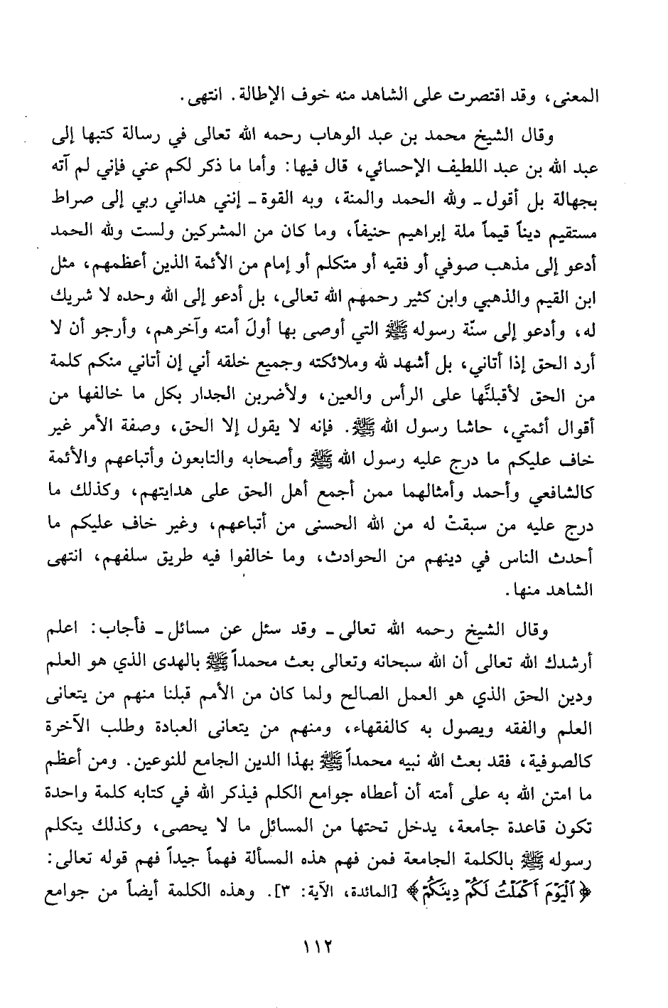 وقال الشيخ محمد بن عبد الوهاب رحمه الله تعالى في رسالة كتبها إلى عبد الله بن عبد اللطيف الإحسائي، قال فيها: وأما ما ذكر لكم عني فإني لم آته بجهالة بل أقول – ولله الحمد والمنة، وبه القوة – إنني هداني ربي إلى صراط مستقيم ديناً قيماً ملة إبراهيم حنيفاً، وما كان من المشركين ولست ولله الحمد أدعوا إلى مذهب صوفي أو فقيه أو متكلم أو إمام من الأئمة الذين أعظمهم، مثل ابن القيم والذهبي وابن كثير رحمهم الله تعالى، بل أدعوا إلى الله وحده لا شريك له، وأدعو إلى سنة رسوله صلى الله عليه وسلم التي أوصى بها أول أمته وآخرهم، وأرجو أن لا أرد الحق إذا أتاني، بل أشهد لله وملائكته وجميع خلقه أني إن أتاني منكم كلمة من الحق لأقبلنها على الرأس والعين، ولأضربن الجدار بكل ما خالفها من أقوال أئمتي، حاشا رسول الله صلى الله عليه وسلم وأصحابه والتابعون وأتباعهم والأئمة كالشافعي وأحمد وأمثالهما ممن أجمع أهل الحق على هدايتهم، وكذلك ما درج عليه من سبقت له من الله الحسنى من أتباعهم، وغير خاف عليكم ما أحدث الناس في دينهم من الحوادث، وما خالفوا فيه طريق سلفهم، انتهى الشاهد منها.