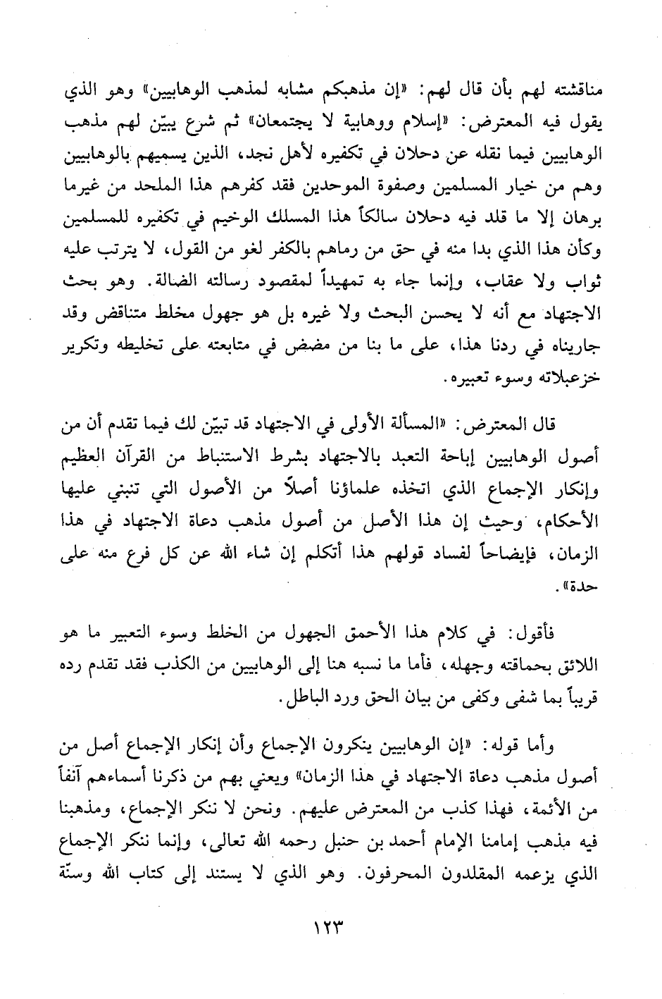 مناقشته لهم بأن قال لهم: "إن مذهبكم مشابه لمذهب الوهابيين" وهو الذي يقول فيه المعترض: "إسلام ووهابية لا يجتمعان" ثم شرع يبين لهم مذهب الوهابيين فيما نقله عن دحلان في تكفيره لأهل نجد، الذين يسميهم بالوهابيين وهم من خيار المسلمين وصفوة الموحدين فقد كفرهم هذا الملحد من غيرما برهان إلا ما قلد فيه دحلان سالكاً هذا المسلك الوخيم في تكفيره للمسلمين وكأن هذا الذي بدا منه في حق من رماهم بالكفر لغو من القول، لا يترتب عليه ثواب ولا عقاب، وإنما جاء به تمهيداً لمقصود رسالته الضالة. وهو بحث الاجتهاد مع أنه لا يحسن البحث ولا غيره بل هو جهول مخلط متناقض وقد جاريناه في ردنا هذا، على ما بنا من مضض في متابعته على تخليطه وتكرير خزعبلاته وسوء تعبيره.