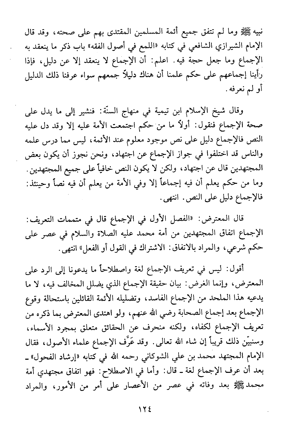 نبيه صلى الله عليه وسلم وما لم تتفق جميع أئمة المسلمين المقتدى بهم على صحته، وقد قال الإمام الشيرازي الشافعي في كتابه "اللمع في أصول الفقه" باب ذكر ما ينعقد به الإجماع وما جعل حجة فيه. اعلم: أن الإجماع لا ينعقد إلا عن دليل، فإذا رأينا إجماعهم على حكم علمنا أن هناك دليلاً جمعهم سواء عرفنا ذلك الدليل أو لم نعرفه.