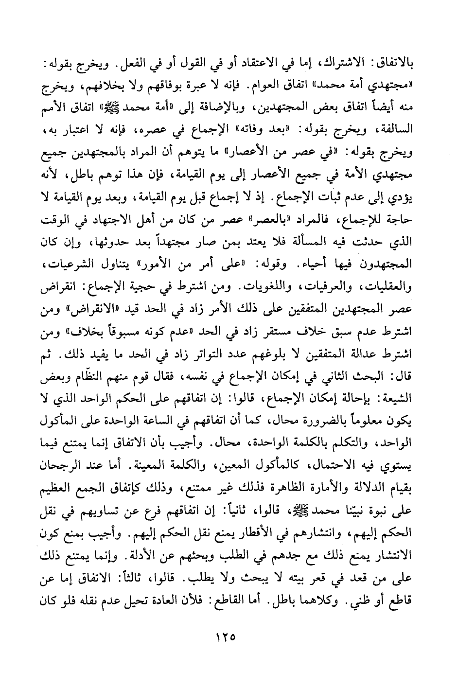 بالاتفاق: الاشتراك، إما في الاعتقاد أو في القول أو في الفعل. ويخرج بقوله: "مجتهدي أمة محمد" اتفاق العوام. فإنه لا عبرة بوفاقهم ولا بخلافهم، ويخرج منه أيضاً اتفاق بعض المجتهدين، وبالإضافة إلى "أمة محمد صلى الله عليه وسلم" اتفاق الأمم السالفة، ويخرج بقوله: "بعد وفاته" الإجماع في عصره، فإنه لا اعتبار به، ويخرج بقوله: "في عصر من الأعصار" ما يتوهم أن المراد بالمجتهدين جميع مجتهدي الأمة في جميع الأعصار إلى يوم القيامة، فإن هذا توهم باطل، لأنه يؤدي إلى عدم ثبات الإجماع. إذ لا إجماع قبل يوم القيامة، وبعد يوم القيامة لا حاجة للإجماع، فالمراد "بالعصر" عصر من كان من أهل الاجتهاد في الوقت الذي حدثت فيه المسألة فلا يعتد بمن صار مجتهداً بعد حدوثها، وإن كان المجتهدون فيها أحياء. وقوله: "على أمر من الأمور" يتناول الشرعيات، والعقليات، والعرفيات، واللغويات. ومن اشترط في حجية الإجماع: انقراض عصر المجتهدين المتفقين على ذلك الأمر زاد في الحد قيد "الانقراض" ومن اشترط عدم سبق خلاف مستقر زاد في الحد "عدم كونه مسبوقاً بخلاف" ومن اشترط عدالة المتفقين لا بلوغهم عدد التواتر زاد في الحد ما يفيد ذلك. ثم قال: البحث الثاني في إمكان الإجماع في نفسه، فقال قوم منهم النظام وبعض الشيعة: بإحالة إمكان الإجماع، قالوا: إن اتفاقهم على الحكم الواحد الذي لا يكون معلوماً بالضرورة محال، كما أن اتفاقهم على الحكم الواحد الذي لا يكون معلوماً بالضرورة محال، كما أن اتفاقهم في الساعة الواحدة على المأكول الواحد، والتكلم بالكلمة الواحدة، محال. وأجيب بأن الاتفاق إنما يمتنع فيما يستوي فيه الاحتمال، كالمأكول المعين، والكلمة العينة. أما عند الرجحان بقيام الدلالة والأمارة الظاهرة فذلك غير ممتنع، وذلك كإتفاق الجمع العظيم على نبوة نبينا محمد صلى الله عليه وسلم، قالوا، ثانياً: إن اتفاقهم فرع عن تساويهم في نقل الحكم إليهم، وانتشارهم في الأقطار يمنع نقل الحكم إليهم. وأجيب بمنع كون الانتشار يمنع ذلك مع جدهم في الطلب وبحثهم عن الأدلة. وإنما يمتنع ذلك على من قعد في قعر بيته لا يبحث ولا يطلب. قالوا، ثالثاً: الاتفاق إما عن قاطع أو ظني. وكلاهما باطل. أما القاطع: فلأن العادة تحيل عدم نقله فلو كان