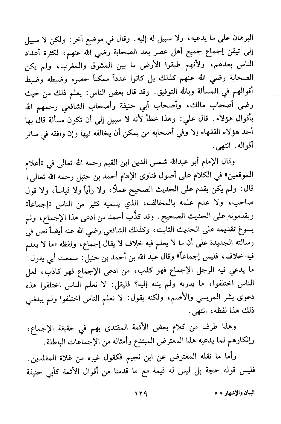 وقال الإمام أبو عبد الله شمس الدين ابن القيم رحمه الله تعالى في "أعلام الموقعين" في الكلام على أصول فتاوى الإمام أحمد بن حنبل رحمه الله تعالى، قال: ولم يكن يقدم على الحديث الصحيح عملاً، ولا رأياً ولا قياساً، ولا قول صاحب، ولا عدم علمه بالمخالف، الذي يسميه كثير من الناس "إجماعاً" ويقدمونه على الحديث الصحيح. وقد كذب أحمد من ادعى هذا الإجماع، ولم يسوغ تقديمه على الحديث الثابت، وكذلك الشافعي رضي الله عنه أيضاً نص في رسالته الجديدة على أن ما لا يعلم فيه خلاف لا يقال إجماع، ولفظه "ما لا يعلم فيه خلاف، فليس إجماعاً" وقال عبد الله بن أحمد بن حنبل: سمعت أبي يقول: ما يدعي فيه الرجل الإجماع فهو كذب، من ادعى الإجماع فهو كاذب، لعل الناس اختلفوا، مايدريه ولم ينته إليه؟ فليقل: لا نعلم الناس اختلفوا هذه دعوى بشر المريسي والأصم، ولكنه يقول: لا نعلم الناس اختلفوا ولم يبلغني ذلك هذا لفظه، انتهى.