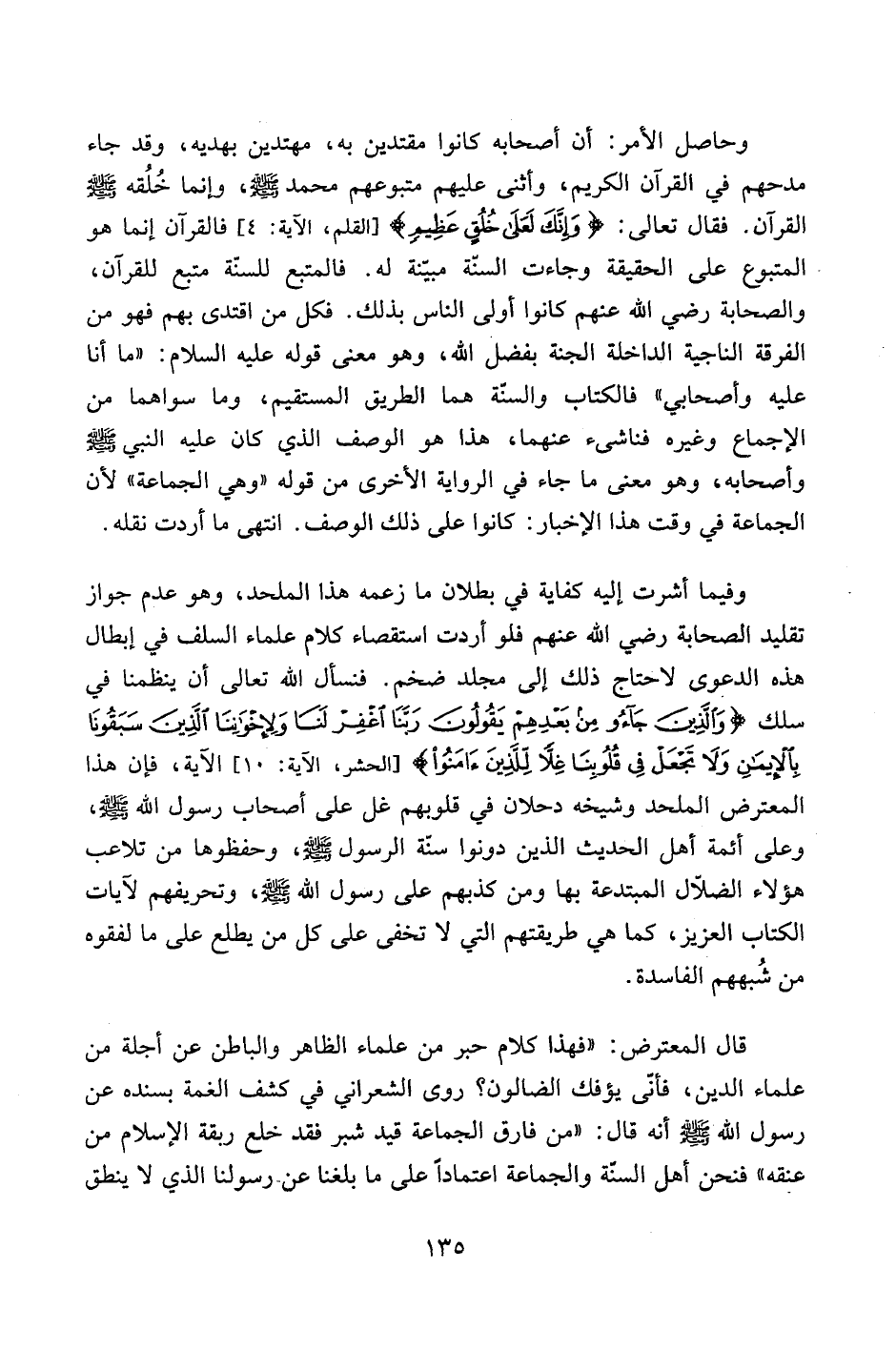 وفيما أشرت إليه كفاية في بطلان ما زعمه هذا الملحد، وهو عدم جواز تقليد الصحابة رضي الله عنهم فلو أردت استقصاء كلام علماء السلف في إبطال هذه الدعوى لاحتاج ذلك إلى مجلد ضخم. فنسأل الله تعالى أن ينظمنا في سلك {وَالَّذِينَ جَاءُوا مِنْ بَعْدِهِمْ يَقُولُونَ رَبَّنَا اغْفِرْ لَنَا وَلِإِخْوَانِنَا الَّذِينَ سَبَقُونَا بِالْأِيمَانِ وَلا تَجْعَلْ فِي قُلُوبِنَا غِلّاً لِلَّذِينَ آمَنُوا} [الحشر، الآية:10] الآية، فإن هذا المعترض الملحد وشيخه دحلان في قلوبهم غل على أصحاب رسول الله صلى الله عليه وسلم، وعلى أئمة أهل الحديث الذين دونوا سنة الرسول صلى الله عليه وسلم، وحفظوها من تلاعب هؤلاء الضلال المبتدعة بها ومن كذبهم على رسول الله صلى الله عليه وسلم، وتحريفهم لآيات الكتاب العزيز، كما هي طريقتهم التي لا تخفى على كل من يطلع على ما لفقوه من شبههم الفاسدة.