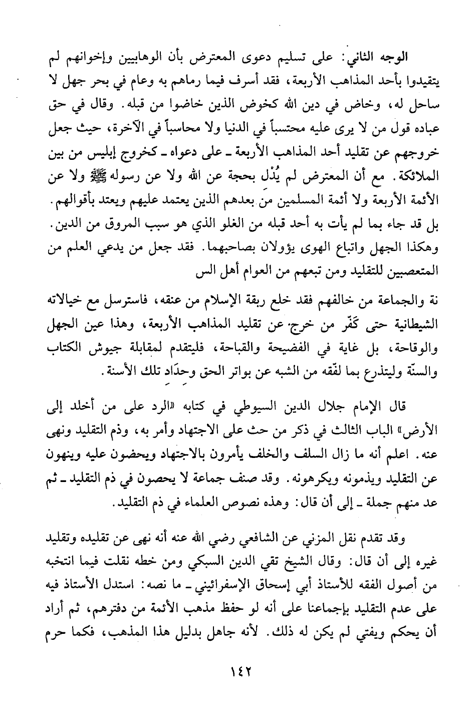 الوجه الثاني: على تسليم دعوى المعترض بأن الوهابيين وإخوانهم لم يتقيدوا بأحد المذاهب الأربعة، فقد أسرف فيما رماهم به وعام في بحر جهل لا ساحل له، وخاض في دين الله كخوض الذين خاضوا من قبله. وقال في حق عبادة قول من لا يرى عليه محتسباً في الدنيا ولا محاسباً في الآخرة، حيث جعل خروجهم عن تقليد أحد المذاهب الأربعة- على دعواه – كخروج إبليس من بين الملائكة. مع أن المعترض لم يدل بحجة عن الله ولا عن رسوله صلى الله عليه وسلم ولا عن الأئمة الأربعة ولا أئمة المسلمين من بعدهم الذين يعتمد عليهم ويعتد بأقوالهم. بل قد جاء بما لم يأت به أحد قبله من الغلو الذي هو سبب المروق من الدين. وهكذا الجهل واتباع الهوى يؤولان بصاحبهما. فقد جعل من يدعي العلم من المتعصبين للتقليد ومن تبعهم من العوام أهل السنة والجماعة من خالفهم فقد خلع ربقة الإسلام من عنقه، فاسترسل مع خيالاته الشيطانية حتى كفر من خرج عن تقليد المذاهب الأربعة، وهذا عين الجهل والوقاحة، بل غاية في الفضيحة والقباحة، فليتقدم لمقابلة جيوش الكتاب والسنة وليتذرع بما لفقه من الشبه عن بواتر الحق وحداد تلك الأسنة.