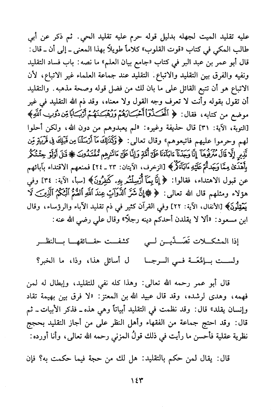 وقال أبو عمر رحمه الله تعالى: وهذا كله نفي للتقليد، وإبطال له لمن فهمه، وهدى لرشده، وقد قال عبيد الله بن المعتز: "لا فرق بين بهيمة تقاد وإنسان يقلد" قال: وقد نظمت في التقليد أبياتاً وهي هذه -فذكر الأبيات- ثم قال: وقد احتج جماعة من الفقهاء وأهل النظر على من أجاز التقليد بحجج نظرية عقلية فأحسن ما رأيت في ذلك قول المزني رحمه الله تعالى، وأنا أورده: قال: يقال لمن حكم بالتقليد: هلي لك من حجة فيما حكمت به؟ فإن