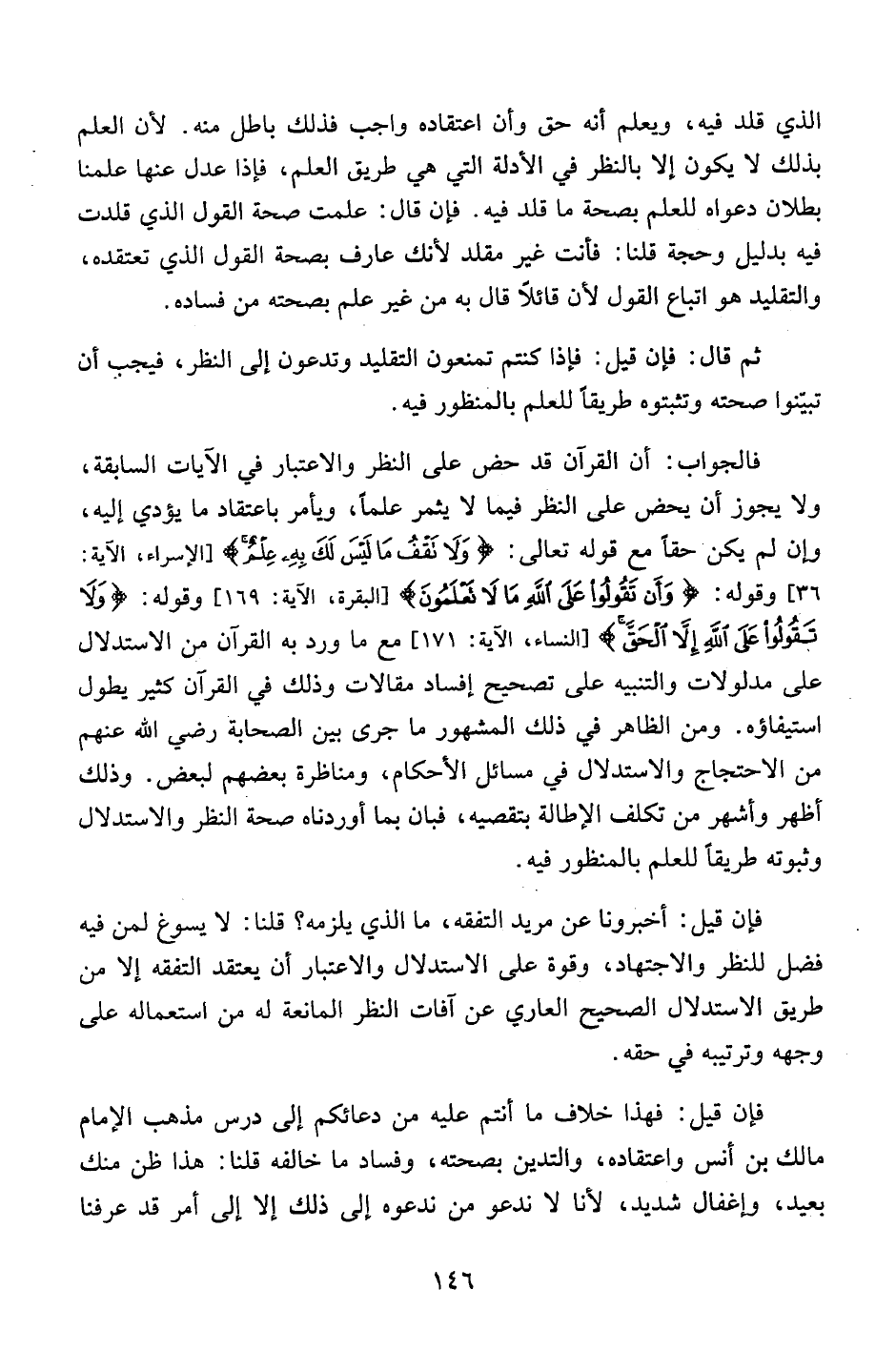 فالجواب: أن القرآن قد حض على النظر والاعتبار في الآيات السابقة، ولا يجوز أن يحض على النظر فيما لا يثمر علماً، ويأمر باعتقاد ما يؤدي إليه، وإن لم يكن حقاً مع قوله تعالى: {وَلا تَقْفُ مَا لَيْسَ لَكَ بِهِ عِلْمٌ} [الإسراء، الآية:36] وقوله: {وَأَنْ تَقُولُوا عَلَى اللَّهِ مَا لا تَعْلَمُونَ} [البقرة، الآية:169] وقوله: {وَلا تَقُولُوا عَلَى اللَّهِ إِلاَّ الْحَقَّ} [النساء، الآية:171] مع ما ورد به القرآن من الاستدلال على مدلولات والتنبيه على تصحيح إفساد مقالات وذلك في القرآن كثير يطول استيفاؤه. ومن الظاهر في ذلك المشهور ما جرى بين الصحابة رضي الله عنهم من الاحتجاج والاستدلال في مسائل الأحكام، ومناظرة بعضهم لبعض. وذلك أظهر وأشهر من تكلف الإطالة بتقصيه، فبان بما أوردناه صحة النظر والاستدلال وثبوته طريقاً للعلم بالمنظور فيه.