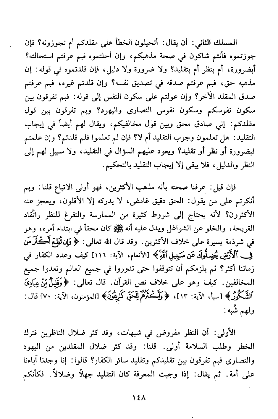 الأولى: أن النظر مفروض في شبهات، وقد كثر ضلال الناظرين فترك الخطر وطلب السلامة أولى. قلنا: وقد كثر ضلال المقلدين من اليهود والنصارى فبم تفرقون بين تقليدكم وتقليد سائر الكفار؟ قالوا: إنا وجدنا آباءنا على أمة. ثم يقال: إذا وجبت المعرفة كان التقليد جهلاً وضلالاً. فكأنكم