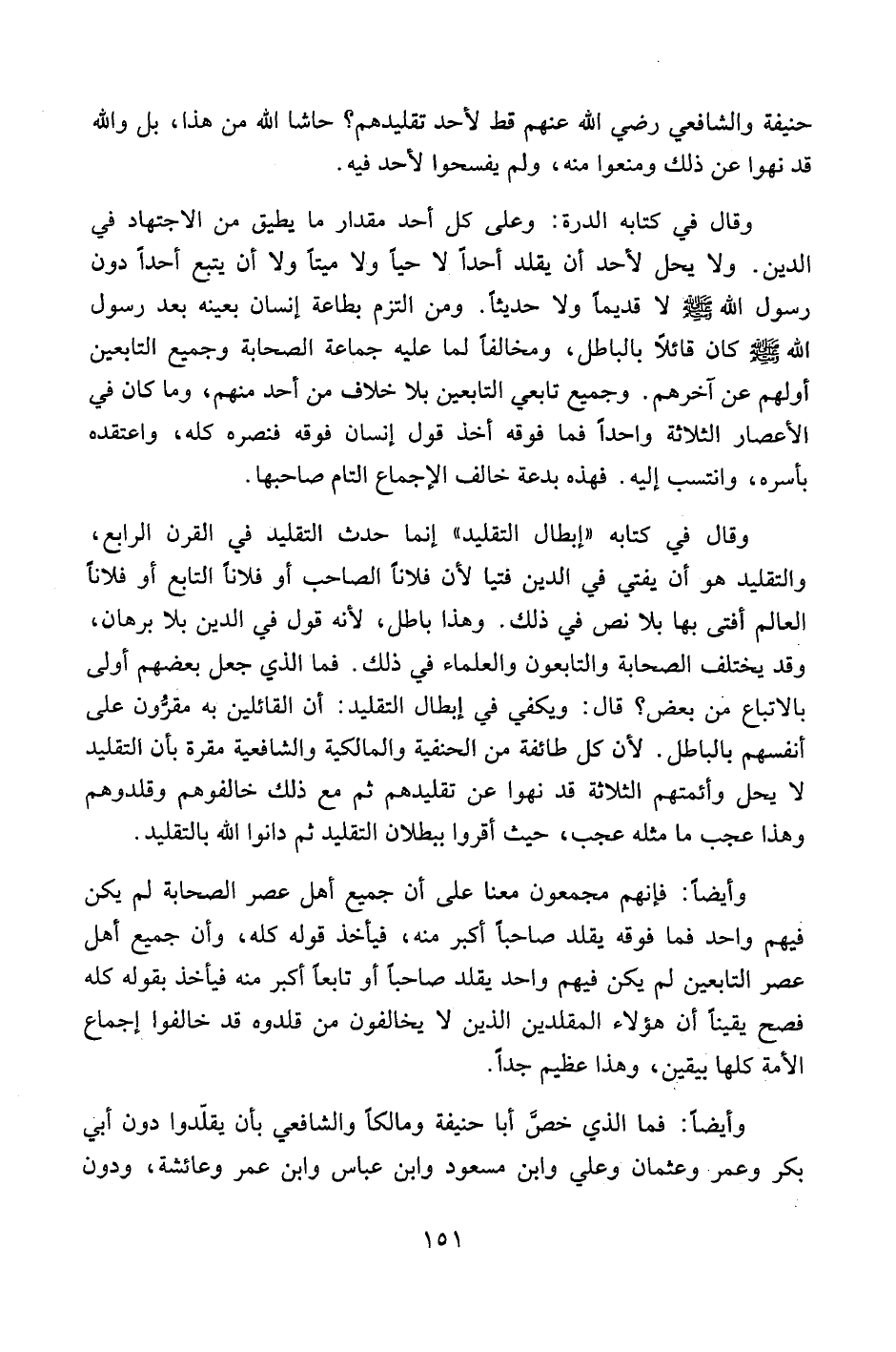 وأيضاً: فإنهم مجمعون معنا على أن جميع أهل عصر الصحابة لم يكن فيهم واحد فما فوقه يقلد صاحباً أكبر منه، فيأخذ قوله كله، وأن جميع أهل عصر التابعين لم يكن فيهم واحد يقلد صاحباً أو تابعاً أكبر منه فيأخذ بقوله كله فصح بقيناً أن هؤلاء المقلدين الذين لا يخالفون من قلدوه قد خالفوا إجماع الأمة كلها بيقين، وهذا عظيم جداً. وأيضاً: فما الذي خص أبا حنيفة ومالكاً والشافعي بأن يقلدوا دون أبي بكر وعمر وعثمان وعلي وابن مسعود وابن عباس وابن عمر وعائشة، ودون