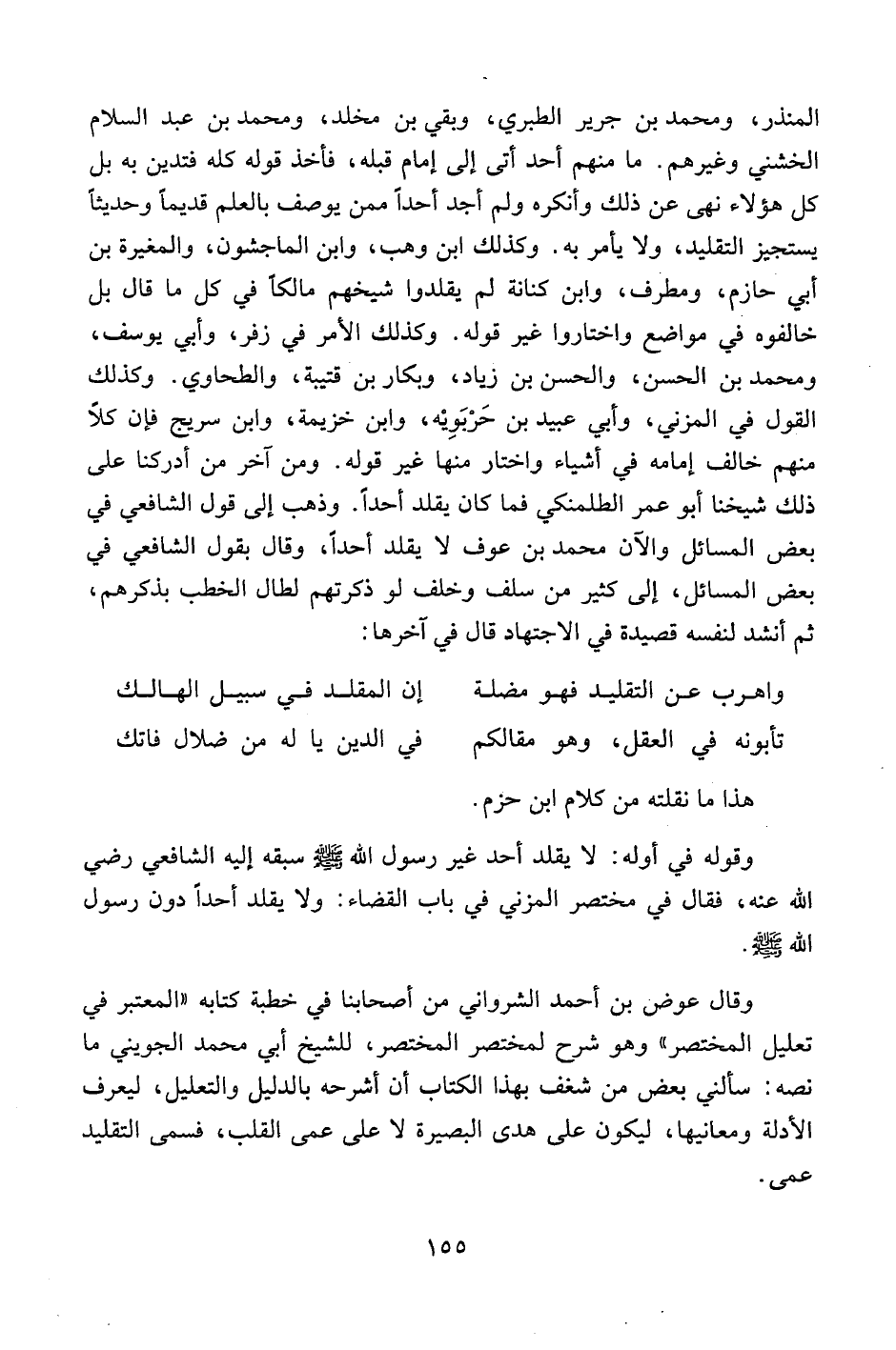 النذر، ومحمد بن جرير الطبري، وبقي بن مخلد، ومحمد بن عبد السلام الخشني وغيرهم. ما منهم أحد أتى إلى إمام قبله، فأخذ قوله كله فتدين به بل كل هؤلاء نهى عن ذلك وأنكره ولم أجد أحداً ممن يوصف بالعلم قديماً وحديثاً يستجيز التقليد، ولا يأمر به. وكذلك ابن وهب، وابن الماجشون، والمغيرة بن أبي حازم، ومطرف، وابن كنانة لم يقلدوا شيخهم مالكاً في كل ما قال بل خالفوه في مواضع واختاروا غير وقوله. وكذلك الأمر في زفر، وأبي يوسف، ومحمد بن الحسن، والحسن بن زياد، وبكار بن قتيبة، والطحاوي. وكذلك القول في المزني، وأبي عبيد بن حربويه، وابن خزيمة، وابن سريج فإن كلاً منهم خالف إمامه في أشياء واختار منها غير قوله. ومن آخر من أدركنا على ذلك شيخنا أبو عمر الطلمنكي فما كان يقلد أحد وذهب إلى قول الشافعي في بعض المسائل والآن محمد بن عوف لا يقلد أحداً، وقال بقول الشافعي في بعض المسائل، إلى كثير من سلف وخلف لو ذكرتهم لطال الخطب بذكرهم، ثم أنشد لنفسه قصيدة في الاجتهاد قال في آخرها: