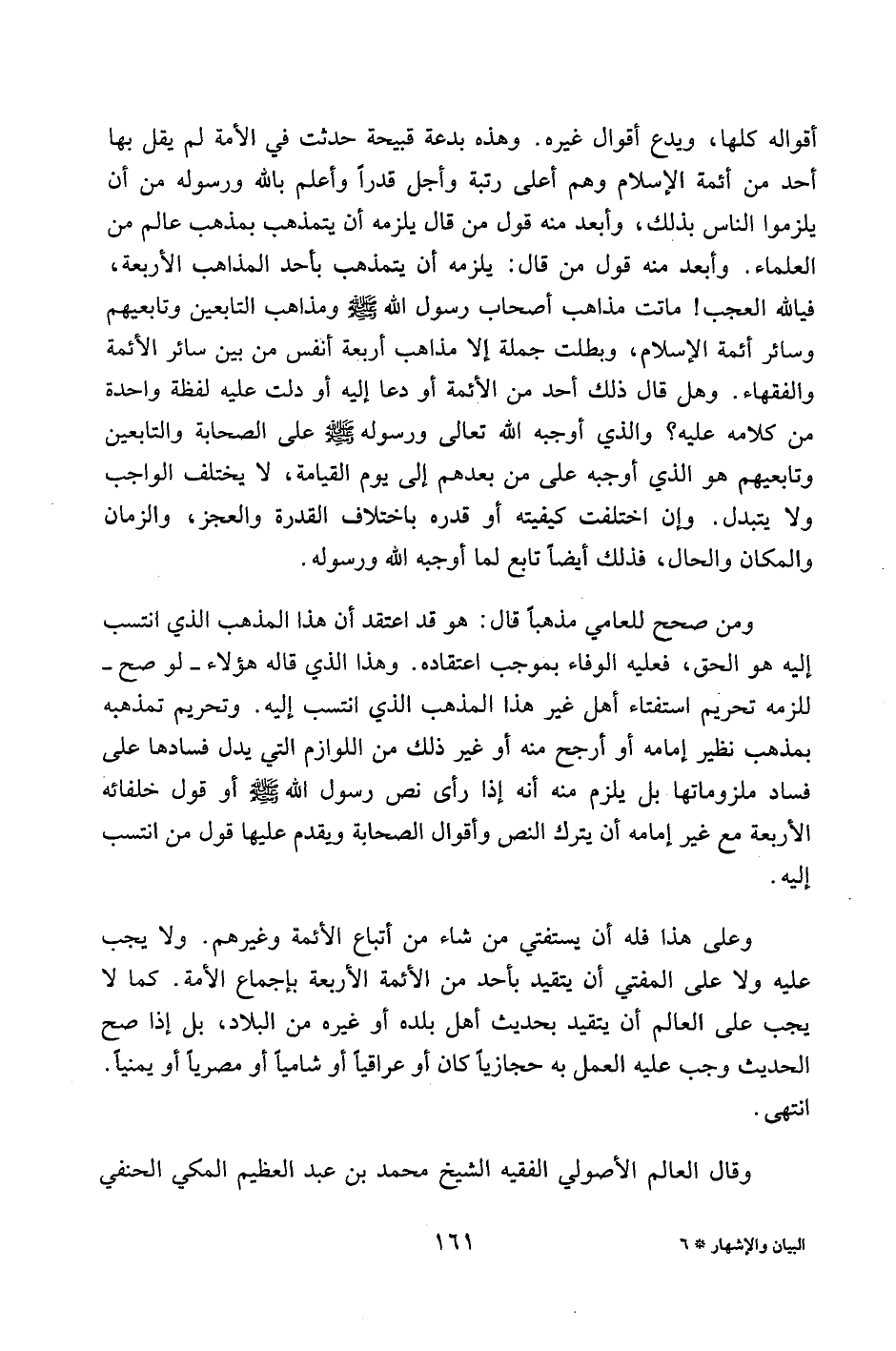 وعلى هذا فله أن يستفتي من شاء من أتباع الأئمة وغيرهم. ولا يجب عليه ولا على المفتي أن يتقيد بأحد من الأئمة الأربعة بإجماع الأمة. كما لا يجب على العالم أن يتقيد بحديث أهل بلده أو غيره من البلاد، بل إذا صح الحديث وجب عليه العمل به حجازياً كان أو عراقياً أو شامياً أو مصرياً أو يمنياً. انتهى.