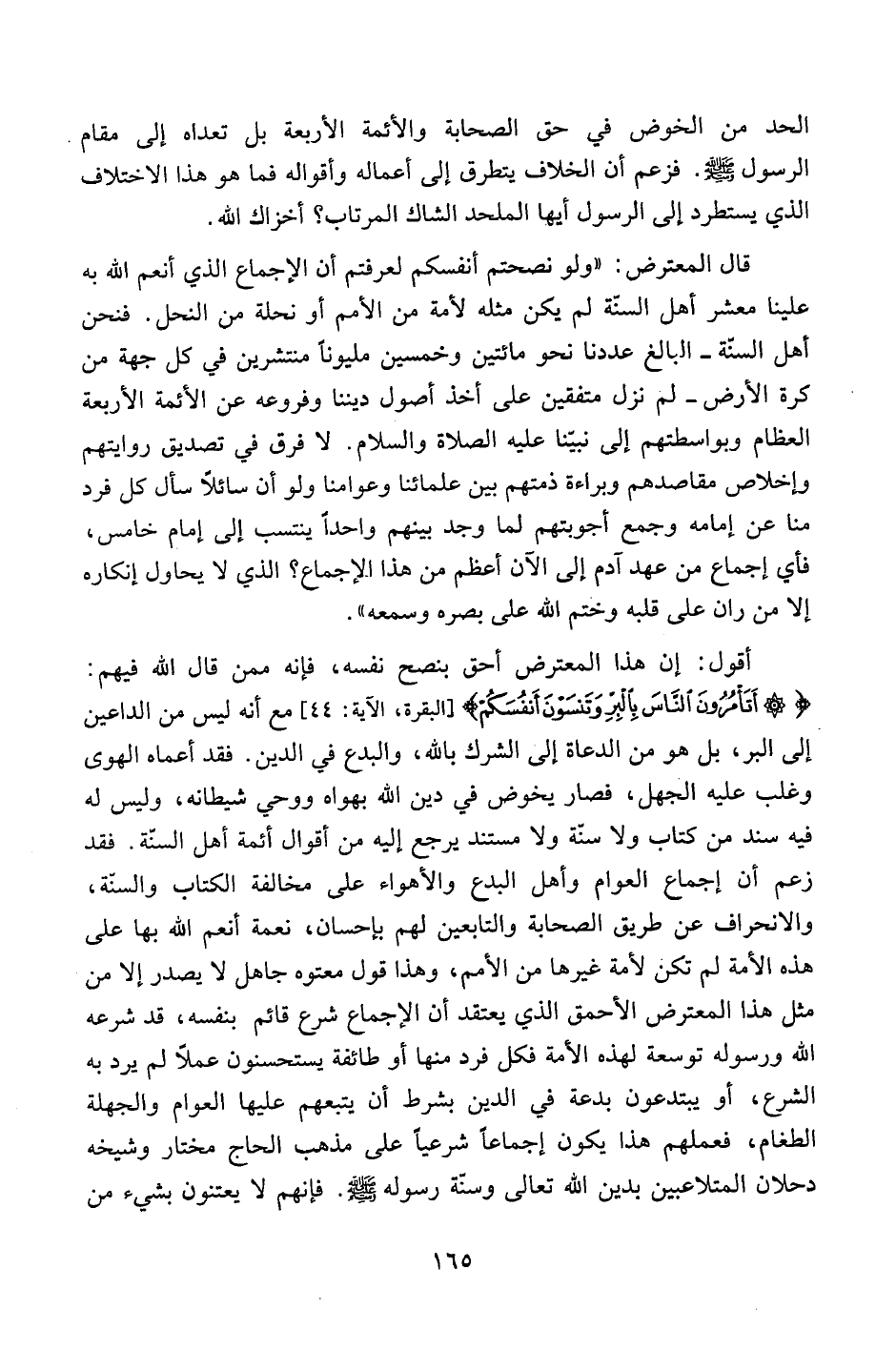 قال المعترض: "ولو نصحتم أنفسكم لعرفتم أن الإجماع الذي أنعم الله به علينا معشر أهل السنة لم يكن مثله لأمة من الأمم أو نحلة من النحل. فنحن أهل السنة – البالغ عددنا نحو ما ئتين وخمسين مليوناً منتشرين في كل جهة من كرة الأرض – لم نزل تفقين على أخذ أصول ديننا وفروعه عن الأئمة الأبعة العظام وبواسطتهم إلى نبيناً عليه الصلاة والسلام. لا فرق في تصديق روايتهم وإخلاص مقاصدهم وبراءة ذمتهم بين علمائنا وعوامنا ولو أن سائلاً سأل كل فرد منا عن إمامه وجمع أجوبتهم لما وجد بينهم واحداً ينتسب إلى إمام خامس، فأي إجماع من عهد آدم إلى الآن أعظم من هذا الإجماع؟ الذي لا يحاول إنكاره إلا من ران على قلبه وختم الله على بصره وسمعه".