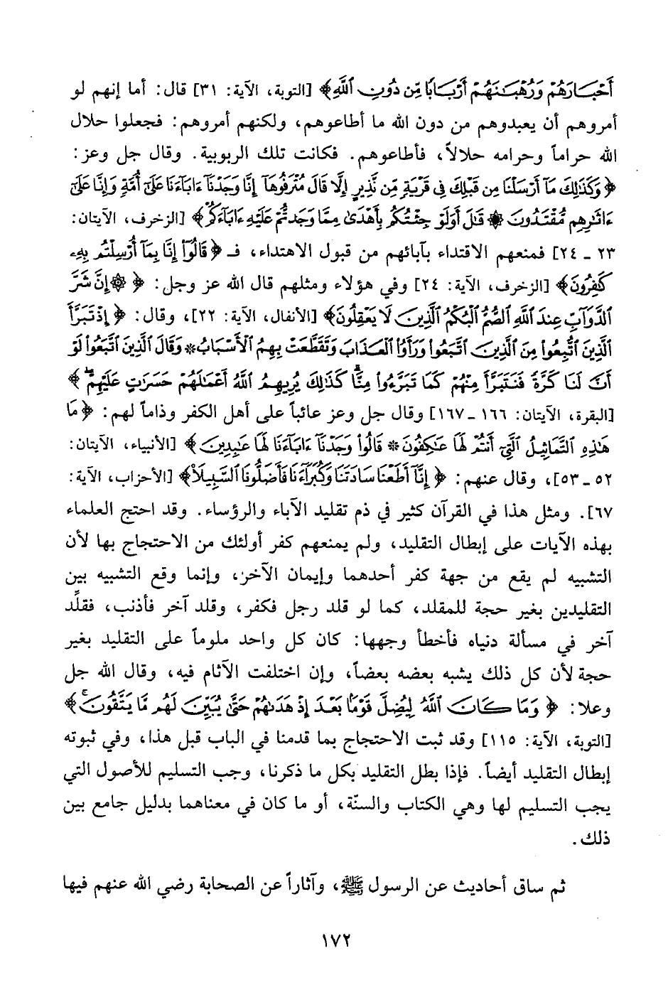 أَحْبَارَهُمْ وَرُهْبَانَهُمْ أَرْبَاباً مِنْ دُونِ اللَّهِ} [التوبة، الآية: 31] قال: أما أنهم لو أمروهم أن يعبدوهم من دون الله ما أطاعوهم، ولكنهم أمروهم: فجعلوا حلال الله حرماً وحرامه حلالاً، فأطاعوهم. فكانت تلك الربوبية. وقال جل وعز: {وَكَذَلِكَ مَا أَرْسَلْنَا مِنْ قَبْلِكَ فِي قَرْيَةٍ مِنْ نَذِيرٍ إِلاَّ قَالَ مُتْرَفُوهَا إِنَّا وَجَدْنَا آبَاءَنَا عَلَى أُمَّةٍ وَإِنَّا عَلَى آثَارِهِمْ مُقْتَدُونَ قَالَ أَوَلَوْ جِئْتُكُمْ بِأَهْدَى مِمَّا وَجَدْتُمْ عَلَيْهِ آبَاءَكُمْ} [الزخرف، الآيتان: 23- 24] فمنعهم الاقتداء بآبائهم من قبول الاهتداء، فـ {قَالُوا إِنَّا بِمَا أُرْسِلْتُمْ بِهِ كَافِرُونَ} [الزخرف، الآية: 24] وفي هؤلاء ومثلهم قال الله عز وجل: {إِنَّ شَرَّ الدَّوَابِّ عِنْدَ اللَّهِ الصُّمُّ الْبُكْمُ الَّذِينَ لا يَعْقِلُونَ} [الأنفال، الآية: 22] ، وقال: {إِذْ تَبَرَّأَ الَّذِينَ اتُّبِعُوا مِنْ الَّذِينَ اتَّبَعُوا وَرَأَوْا الْعَذَابَ وَتَقَطَّعَتْ بِهِمْ الأَسْبَابُ وَقَالَ الَّذِينَ اتَّبَعُوا لَوْ أَنَّ لَنَا كَرَّةً فَنَتَبَرَّأَ مِنْهُمْ كَمَا تَبَرَّءُوا مِنَّا كَذَلِكَ يُرِيهِمْ اللَّهُ أَعْمَالَهُمْ حَسَرَاتٍ عَلَيْهِمْ} [البقرة، الآيتان: 166- 167] وقال جل وعز عائباً على أهل الكفر وذاماً لهم: {مَا هَذِهِ التَّمَاثِيلُ الَّتِي أَنْتُمْ لَهَا عَاكِفُونَ قَالُوا وَجَدْنَا آبَاءَنَا لَهَا عَابِدِينَ} [الأنبياء، الآيتان: 52 – 53] ، وقال عنهم: {إِنَّا أَطَعْنَا سَادَتَنَا وَكُبَرَاءَنَا فَأَضَلُّونَا السَّبِيلَ} [الأحزاب، الآية: 67] . ومثل هذا في القرآن كثير في ذم تقليد الآباء والرؤساء. وقد احتج العلماء بهذه الآيات على إبطال التقليد، ولم يمنعهم كفر أولئك من الاحتجاج بها لأن التشبيه لم يقع من جهة كفر أحدهما وإيمان الآخر، وإنما وقع التشبيه بين التقليدين بغير حجة للمقلد، كما لو قلد رجل فكفر، وقلد آخر فأذنب، فقلد آخر في مسألة دنياه فأخطأ وجهها: كان كل واحد ملوماً على التقليد بغير حجة لأن كل ذلك يشبه بعضه بعضاً، وإن اختلفت الآثام فيه، وقال الله جل وعلا: {وَمَا كَانَ اللَّهُ لِيُضِلَّ قَوْماً بَعْدَ إِذْ هَدَاهُمْ حَتَّى يُبَيِّنَ لَهُمْ مَا يَتَّقُونَ} [التوبة، الآية: 115] وقد ثبت الاحتجاج بما قدمنا في الباب قبل هذا، وفي ثبوته إبطال التقليد أيضاً. فإذا بطل التقليد بكل ما ذكرنا، وجب التسليم للأصول التي يجب التسليم لها وهي الكتاب والسنة، أو ما كان في معناهما بدليل جامع بين ذلك.