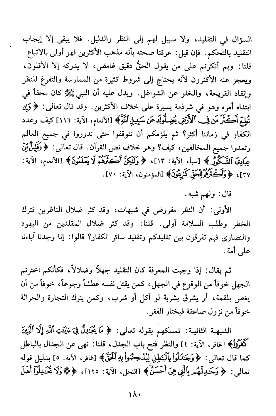 السؤال في التقليد، ولا سبيل لهم إلى النظر والدليل. فلا يبقى إلا إيجاب التقليد بالتحكم. فإن قيل: عرفنا صحته بأنه مذهب الأكثرين فهو أولى بالاتباع. قلنا: وبم أنكرتم على من يقول الحق دقيق غامض، لا يدركه إلا الأقلون، ويعجز عنه الأكثرون لأنه يحتاج إلى شروط كثيرة من الممارسة والتفرغ للنظر وإنقاد القريحة، والخلو عن الشواغل. ويدل عليه أن النبي صلى الله عليه وسلم كان محقاً في ابتداه أمره وهو في شرذمة يسيرة على خلاف الأكثرين. وقد قال تعالى: {وَإِنْ تُطِعْ أَكْثَرَ مَنْ فِي الأَرْضِ يُضِلُّوكَ عَنْ سَبِيلِ اللَّهِ} [الأنعام، الآية: 116] كيف وعدد الكفار في زماننا أكثر؟ ثم يلزمكم أن تتوقفوا حتى تدوروا في جميع العالم وتعدوا جميع المخالفين، كيف؟ وهو خلاف نص القرآن. قال تعالى: {وَقَلِيلٌ مِنْ عِبَادِي الشَّكُورُ} [سبأ، الآية: 13] ، {وَلَكِنَّ أَكْثَرَهُمْ لا يَعْلَمُونَ} [الأنعام، الآية: 37] ، {وَأَكْثَرُهُمْ لِلْحَقِّ كَارِهُونَ} [المؤمنون، الآية: 70] .