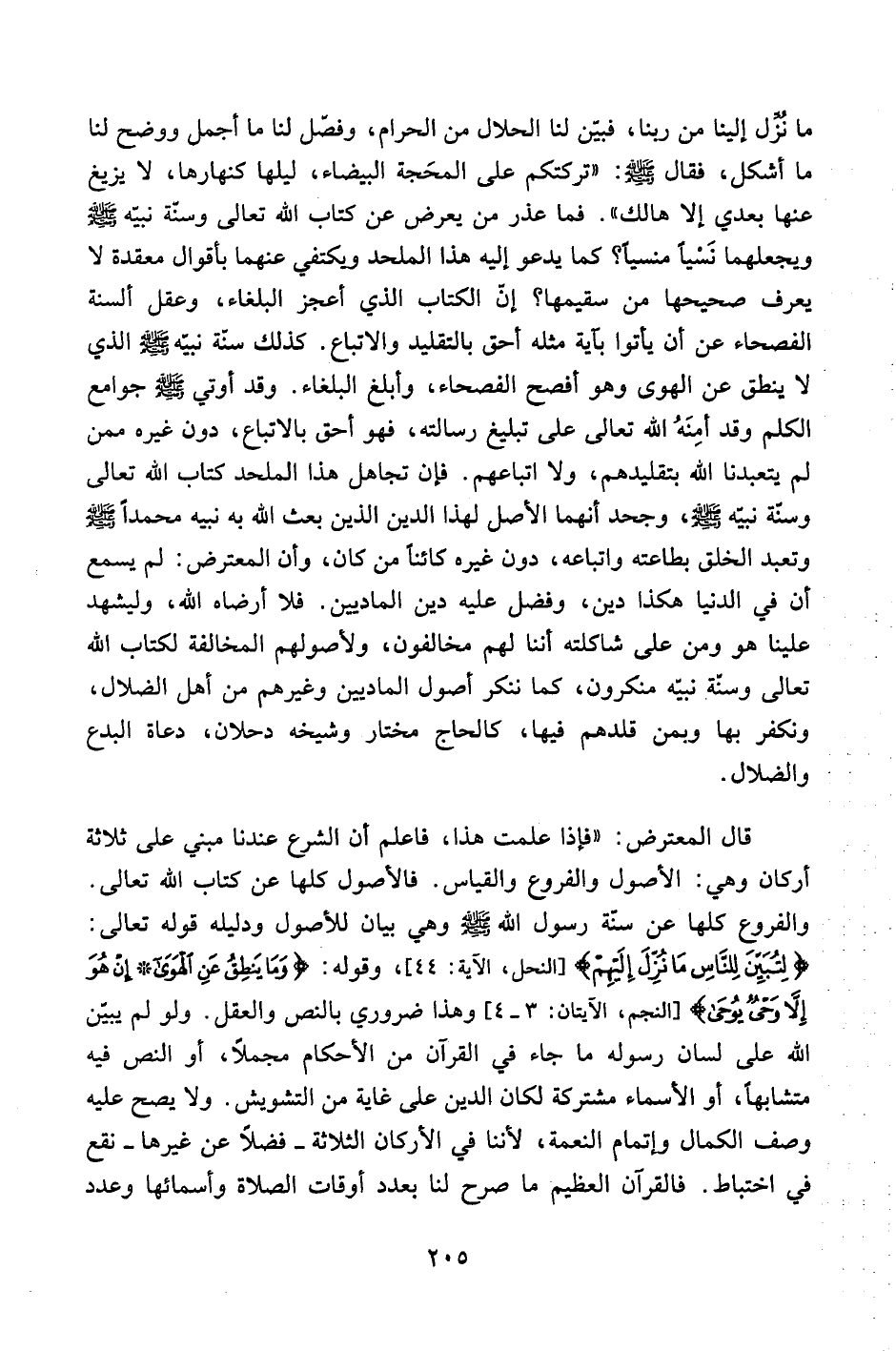 قال المعترض: "فإذا علمت هذا، فاعلم أن الشرع عندنا مبني على ثلاثة أركان وهي: الأصول والفروع والقياس. فالأصول كلها عن كتاب الله تعالى. والفروع كلها عن سنة رسول الله صلى الله عليه وسلم وهي بيان للأصول ودليله قوله تعالى: {لتُبَيِّنَ لِلنَّاسِ مَا نُزِّلَ إِلَيْهِمْ} [النحل، الآية:44] ، وقوله: {وَمَا يَنْطِقُ عَنْ الْهَوَى إِنْ هُوَ إِلاَّ وَحْيٌ يُوحَى} [النجم، الآيتان:3-4] وهذا ضروري بالنص والعقل. ولو لم يبيين الله على لسان رسوله ما جاء في القرآن من الأحكام مجملاً، أو النص فيه متشابهاً، أو الأسماء مشتركة لكان الدين على غاية من التشويش. ولا يصح عليه وصف الكمال وإتمام النعمة، لأننا في الأركان الثلاثة- فضلاً عن غيرها – نقع في اختباط. فالقرآن العظيم ما صرح لنا بعدد أوقات الصلاة وأسمائها وعدد