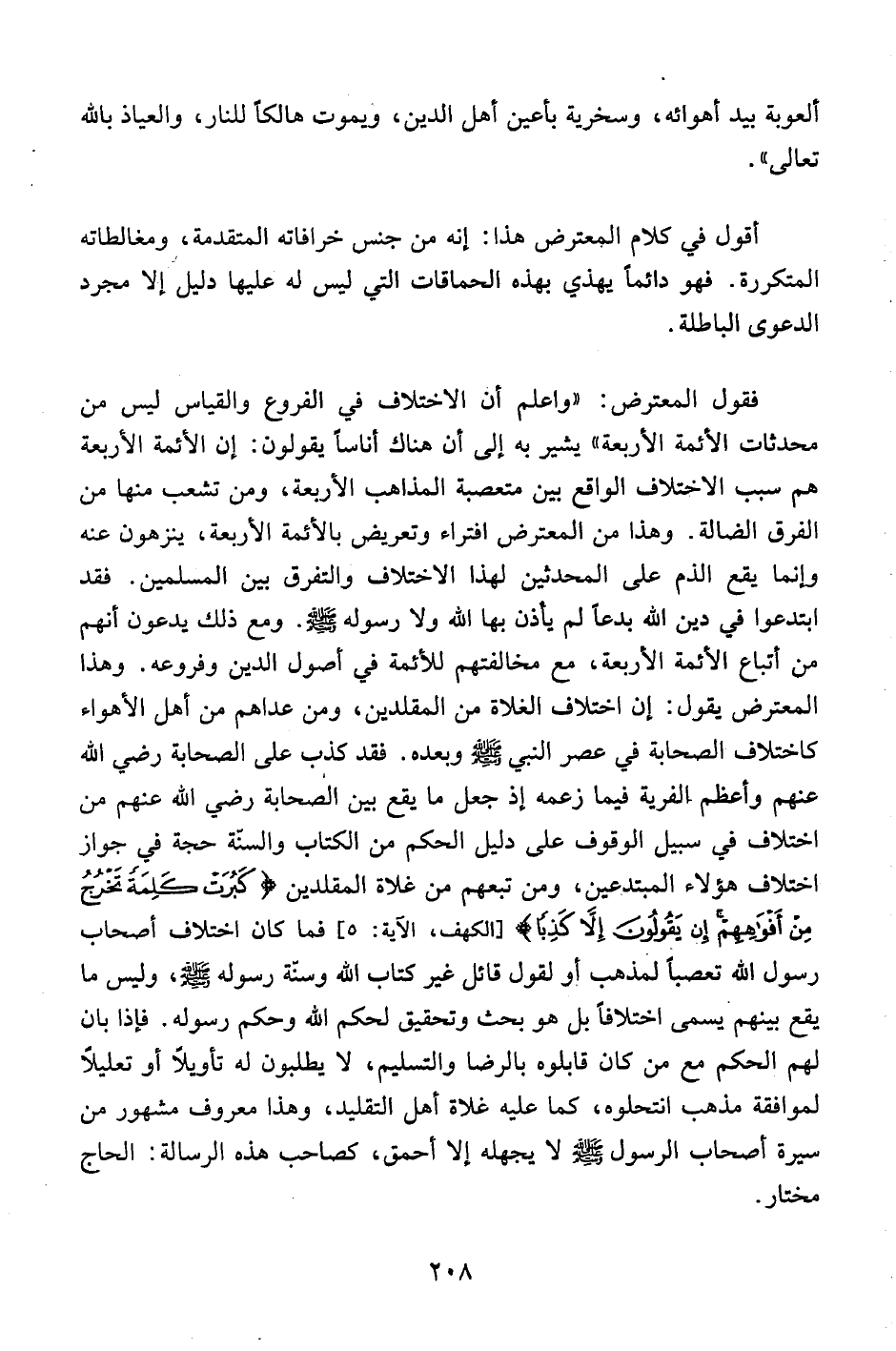 فقول المعترض: "واعلم أن الاختلاف في الفروع والقياس ليس من محدثات الأئمة الأربعة" يشير به إلى أن هناك أناساً يقولون: إن الأئمة الأربعة هم سبب الاختلاف الواقع بين متعصبة المذاهب الأربعة، ومن تشعب منها من الفرق الضالة. وهذا من المعترض افتراء وتعريض بالأئمة الأربعة، ينزهون عنه وإنما يقع الذم على المحدثين لهذا الاختلاف والتفرق بين المسلمين. فقد ابتدعوا في دين الله بدعاً لم يأذن بها الله ولا رسوله صلى الله عليه وسلم. ومع ذلك يدعون أنهم من أتباع الأئمة الأربعة، مع مخالفتهم للأئمة في أصول الدين وفروعه. وهذا المعترض يقول: إن اختلاف الغلاة من المقلدين، ومن عداهم من أهل الأهواء كاختلاف الصحابة في عصر النبي صلى الله عليه وسلم وبعده. فقد كذب على الصحابة رضي الله عنهم وأعظم الفرية فيما زعمه إذ جعل ما يقع بين الصحابة رضي الله عنهم من اختلاف في سبيل الوقوف على دليل الحكم من الكتاب والسنة حجة في جواز اختلاف هؤلاء المبتدعين، ومن تبعهم من غلاة المقلدين {كَبُرَتْ كَلِمَةً تَخْرُجُ مِنْ أَفْوَاهِهِمْ إِنْ يَقُولُونَ إِلَّا كَذِباً} [الكهف، الآية:5] فما كان اختلاف أصحاب رسول الله تعصباً لمذهب أو لقول قائل غير كتاب الله وسنة رسوله صلى الله عليه وسلم، وليس ما يقع بينهم يسمى اختلافاً بل هو بحث وتحقيق لحكم الله وحكم رسوله. فإذا بان لهم الحكم مع من كان قابلوه بالرضا والتسليم، لا يطلبون له تأويلاً أو تعليلاً لموافقة مذهب انتحلوه، كما عليه غلاة أهل التقليد، وهذا معروف مشهور من سيرة أصحاب الرسول صلى الله عليه وسلم لا يجهله إلا أحمق، كصاحب هذه الرسالة: الحاج مختار.