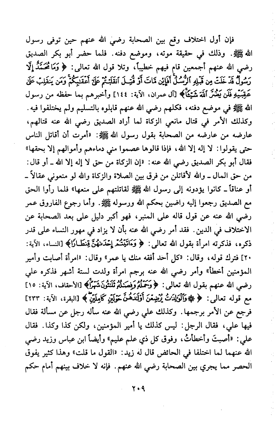 فإن أول اختلاف وقع بين الصحابة رضي الله عنهم حين توفى رسول الله صلى الله عليه وسلم. وذلك في حقيقة موته، وموضع دفنه. فلما حضر أبو بكر الصديق رضي الله عنهم أجمعين قام فيهم خطيباً، وتلا قول الله تعالى: {ومَامُحَمَّدٌ إِلَّا رَسُولٌ قَدْ خَلَتْ مِنْ قَبْلِهِ الرُّسُلُ أَفَإِنْ مَاتَ أَوْ قُتِلَ انْقَلَبْتُمْ عَلَى أَعْقَابِكُمْ وَمَنْ يَنْقَلِبْ عَلَى عَقِبَيْهِ فَلَنْ يَضُرَّ اللَّهَ شَيْئاً} [آل عمران، الآية:144] وأخبرهم بما حفظه من رسول الله صلى الله عليه وسلم في موضع دفنه، فكلهم رضي الله عنهم قابلوه بالتسليم ولم يختلفوا فيه. وكذلك الأمر في قتال مانعي الزكاة لما أراد الصديق رضي الله عنه قتالهم، عارضه من عارضه من الصحابة بقول رسول الله صلى الله عليه وسلم: "أمرت أن أقاتل الناس حتى يقولوا: لا إله إلا الله، فإذا قالوها عصموا مني دماءهم وأموالهم إلا بحقها" فقال أبو بكر الصديق رضي الله عنه: "إن الزكاة من حق لا إله إلا الله- أو قال: من حق المال- والله لأقاتلن من فرق بين الصلاة والزكاة والله لو منعوني عقالاً- أو عناقاً- كانوا يؤدونه إلى رسول الله صلى الله عليه وسلم لقاتلتهم على منعها" فلما رأوا الحق مع الصديق رجعوا إليه راضين بحكم الله ورسوله صلى الله عليه وسلم. وأما رجوع الفاروق عمر رضي الله عنه عن قول قاله على المنبر، فهو أكبر دليل على بعد الصحابة عن الاختلاف في الدين. فقد أمر رضي الله عنه بأن لا يزاد في مهور النساء على قدر ذكره، فذكرته امرأة بقول الله تعالى: {وَآتَيْتُمْ إِحْدَاهُنَّ قِنْطَاراً} [النساء، الآية:20] فترك قوله، وقال: "كل أحد أفقه منك يا عمر" وقال: "امرأة أصابت وأمير المؤمنين أخطأ" وأمر رضي الله عنه برجم امرأة ولدت لست أشهر فذكره علي رضي الله عنهم بقول الله تعالى: {وَحَمْلُهُ وَفِصَالُهُ ثَلاثُونَ شَهْراً} [الأحقاف، الآية:15] مع قوله تعالى: {وَالْوَالِدَاتُ يُرْضِعْنَ أَوْلادَهُنَّ حَوْلَيْنِ كَامِلَيْنِ} [البقرة، الآية:233] فرجع عن الأمر برجمها. وكذلك علي رضي الله عنه سأله رجل عن مسألة فقال فيها علي، فقال الرجل: ليس كذلك يا أمير المؤمنين، ولكن كذا وكذا. فقال علي: "أصبت وأخطأت، وفوق كل ذي علم عليم" وأيضاً ابن عباس وزيد رضي الله عنهما لما اختلفا في الحائض قال له زيد: "القول ما قلت" وهذا كثير يفوق الحصر مما يجري بين الصحابة رضي الله عنهم. فإنه لا خلاف بينهم أمام حكم