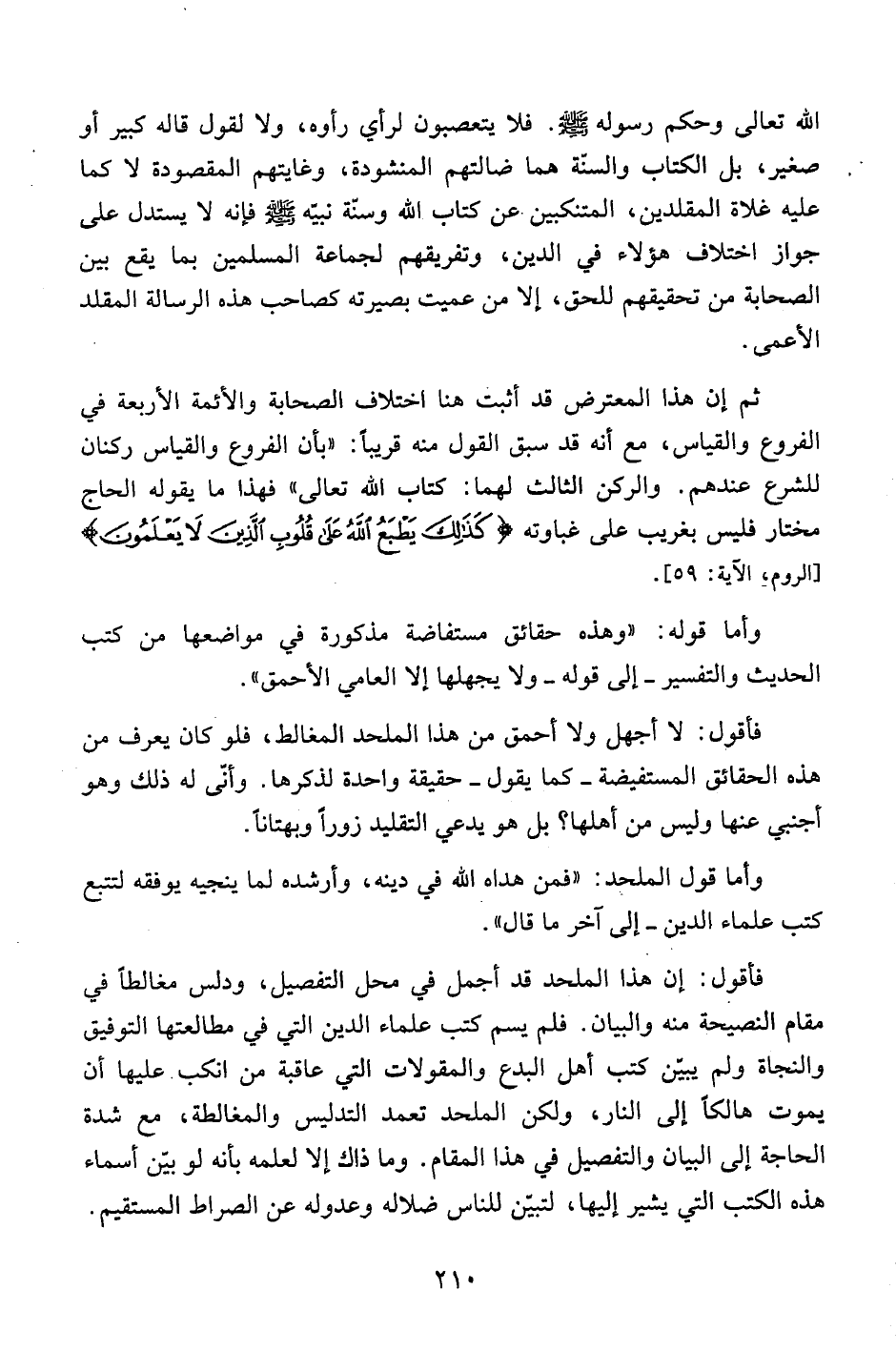 الله تعالى وحكم رسوله صلى الله عليه وسلم. فلا يتعصبون لرأي رأوه، ولا لقول قاله كبير أو صغير، بل الكتاب والسنة هما ضالتهم المنشودة، وغايتهم المقصودة لا كما عليه غلاة المقلدين، المتنكبين عن كتاب الله وسنة نبيه صلى الله عليه وسلم فإنه لا يستدل على جواز اختلاف هؤلاء في الدين، وتفريقهم لجماعة المسلمين بما يقع بين الصحابة من تحقيقهم للحق، إلا من عميت بصيرته كصاحب هذه الرسالة المقلد الأعمى.