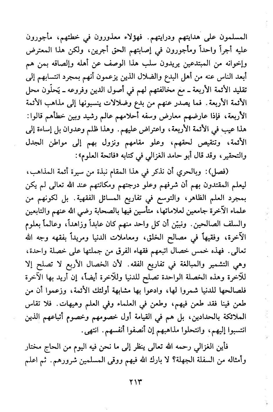 المسلمون على هدايتهم ودرايتهم. فهؤلاء معذورون في خطئهم، مأجورون عليه أجراً واحداً ومأجورون في إصابتهم الحق أجرين، ولكن هذا المعترض وإخوانه من المتدعين يريدون سلب هذا الوصف عن أهله وإلصاقه بمن هم أبعد الناس عنه من أهل البدع والضلال الذين يزعمون أنهم بمجرد انتسابهم إلى تقليد الأئمة الأربعة – مع مخالفتهم لهم في أصول الدين وفروعه – يحلون محل الأئمة الأربعة. فما يصدر عنهم من بدع وضلالات ينسبونها إلى مذاهب الأئمة الأربعة، فإذا عارضهم معارض وسفه أحلامهم عالم رشيد وبين خطأهم قالوا: هذا عيب في الأئمة الأربعة، واعتراض عليهم. وهذا ظلم وعدوان بل إساءة إلى الأئمة، وتنقيص لحقهم، وعلو مقامهم ونزول بهم إلى مواطن الجدل والتحقير، قد قال أبو حامد الغزالي في كتابه "فاتحة العلوم":