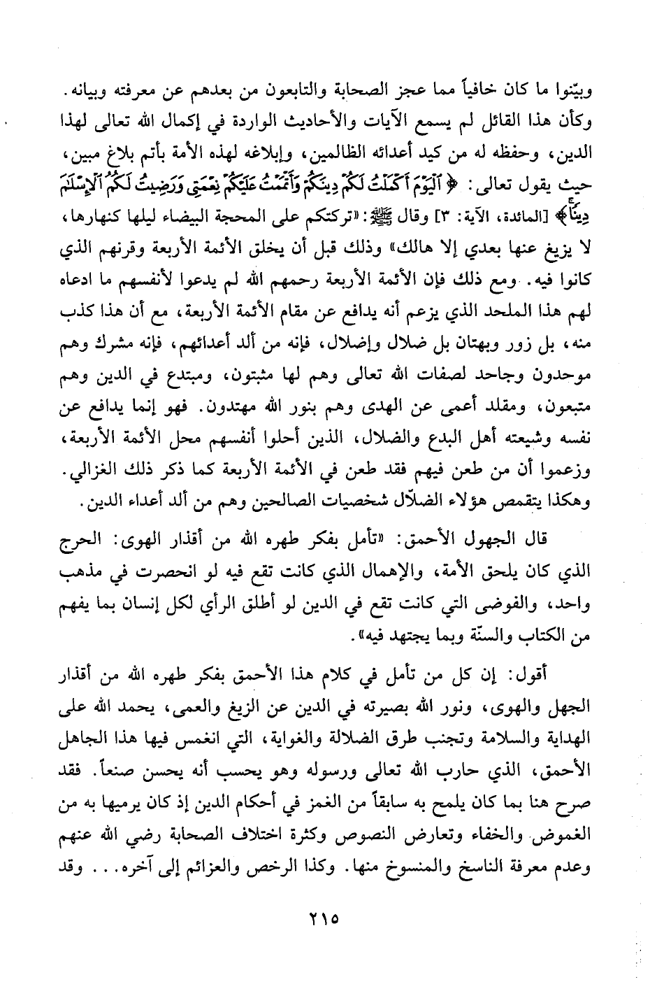 وبينوا ما كان خافياً مما عجز الصحابة والتابعون من بعدهم عن معرفته وبيانه. وكأنه هذا القائل لم يسمع الآيات والأحاديث الواردة في إكمال الله تعالى لهذا الدين، وحفظه له من كيد أعدائه الظالمين، وإبلاغه لهذه الأمة بأتم بلاغ مبين، حيث يقول تعالى: {وَاخْشَوْنِي الْيَوْمَ أَكْمَلْتُ لَكُمْ دِينَكُمْ وَأَتْمَمْتُ عَلَيْكُمْ نِعْمَتِي وَرَضِيتُ لَكُمْ الإِسْلامَ دِيناً} [المائدة، الآية: 3] وقال صلى الله عليه وسلم: "تركتكم على المحجة البيضاء ليلها كنهارها، لا يزيغ عنها بعدي إلا هالك" وذلك وقبل أن يخلق الأئمة الأربعة وقرنهم الذي كانوا فيه. ومع ذلك فإن الأئمة الأربعة رحمهم الله لم يدعوا لأنفسهم ما ادعاه لهم هذا الملحد الذي يزعم أنه يدافع عن مقام الأئمة الأربعة، مع أن هذا كذب منه، بل زور وبهتان بل ضلال وإضلال، فإنه من ألد أعدائهم، فإنه مشرك وهم موحدون وجاحد لصفات الله تعالى وهم لها مثبتون، ومبتدع في الدين وهم متبعون، ومقلد أعمى عن الهدى وهم بنور الله مهتدون. فهو إنما يدافع عن نفسه وشيعته أهل البدع والضلال، الذين أحلوا أنفسهم محل الأئمة الأربعة، وزعموا أن من طعن فيهم فقد طعن في الأئمة الأربعة كما ذكر ذلك الغزالي. وهكذا يتقمص هؤلاء الضلال شخصيات الصالحين وهم من ألد أعداء الدين.