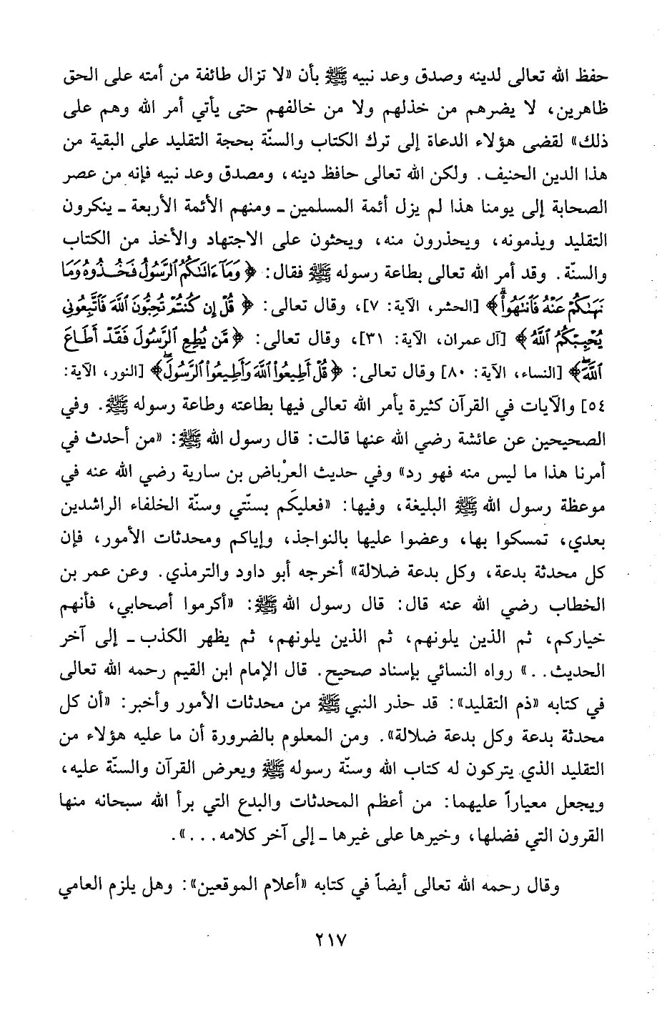 حفظ الله تعالى لدينه وصدق وعد نبيه صلى الله عليه وسلم بأن "لا تزال طائفة من أمته على الحق ظاهرين، لا يضرهم من خذلهم ولا من خالفهم حتى يأتي أمر الله وهم على ذلك" لقضى هؤلاء الدعاة إلى ترك الكتاب والسنة بحجة التقليد على البقية من هذا الدين الحنيف. ولكن الله تعالى حافظ دينه، ومصدق وعد نبيه فإنه من عصر الصحابة إلى يومنا هذا لم يزل أئمة المسلمين- ومنهم الأئمة الأربعة- ينكرون التقليد ويذمونه، ويحذرون منه، ويحثون على الاجتهاد والأخذ من الكتاب والسنة. وقد أمر الله تعالى بطاعة رسول صلى الله عليه وسلم فقال: {وَمَا آتَاكُمْ الرَّسُولُ فَخُذُوهُ وَمَا نَهَاكُمْ عَنْهُ فَانْتَهُوا} [الحشر، الآية: 7] ، وقال تعالى: {قُلْ إِنْ كُنْتُمْ تُحِبُّونَ اللَّهَ فَاتَّبِعُونِي يُحْبِبْكُمْ اللَّهُ} [آل عمران، الآية:31] ، وقال تعالى: {مَنْ يُطِعْ الرَّسُولَ فَقَدْ أَطَاعَ اللَّهَ} [النساء، الآية:80] ، وقال تعالى: {قُلْ أَطِيعُوا اللَّهَ وَأَطِيعُوا الرَّسُولَ} [النور، الآية:54] والآيات في القرآن كثيرة يأمر الله تعالى فيها بطاعته وطاعة رسوله صلى الله عليه وسلم, وفي الصحيحين عن عائشة رضي الله عنها قالت: قال رسول الله صلى الله عليه وسلم: " من أحدث في أمرنا هذا ماليس منه فهو رد" وفي حديث العرباض بن سارية رضي الله عنه في موعظة رسول الله صلى الله عليه وسلم البليغة، وفيها: "فعليكم بسنتي وسنة الخلفاء الراشدين بعدي، تمسكوا بها، وعضوا عليها بالنواجذ، وإياكم ومحدثات الأمور، فإن كل محدثة بدعة، وكل بدعة ضلالة" أخرجه أبو داود والترمذي. وعن عمر بن الخطاب رضي الله عنه قال: قال رسول الله صلى الله عليه وسلم: "أكرموا أصحابي، فأنهم خياركم، ثم الذين يلونهم، ثم الذين يلونهم، ثم يظهر الكذب – إلى آخر الحديث.." رواه النسائي بإسناد صحيح. قال الإمام ابن القيم رحمه الله تعالى في كتابه "ذم التقليد": قد حذر النبي صلى الله عليه وسلم من محدثات الأمور وأخبر: "أن كل محدثة بدعة وكل بدعة ضلالة". ومن المعلوم بالضرورة أن ما عليه هؤلاء من التقليد الذي يتركون له كتاب الله وسنة رسوله صلى الله عليه وسلم ويعرض القرآن والسنة عليه، ويجعل معياراً عليهما: من أعظم المحدثات والبدع التي برأ الله سبحانه منها القرون التي فضلها، وخيرها على غيرها – إلى آخر كلامه ... ".