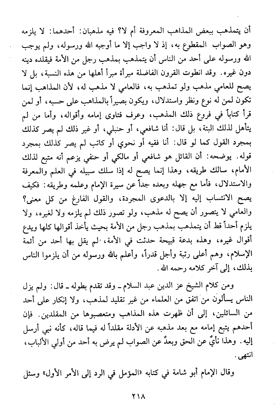 ومن كلام الشيخ عز الدين عبد السلام – وقد تقدم بطوله – قال: ولم يزل الناس يسألون من اتفق من العلماء من غير تقليد لمذهب، ولا إنكار على أحد من السائلين، إلى أن ظهرت هذه المذاهب ومتعصبوها من المقلدين. فإن أحدهم يتبع إمامه مع بعد مذهبه عن الأدلة مقلداً له فيما قاله، كأنه نبي أرسل إليه. وهذا نأي عن الحق وبعد عن الصواب لم يرض به أحد من أولي الألباب، انتهى.