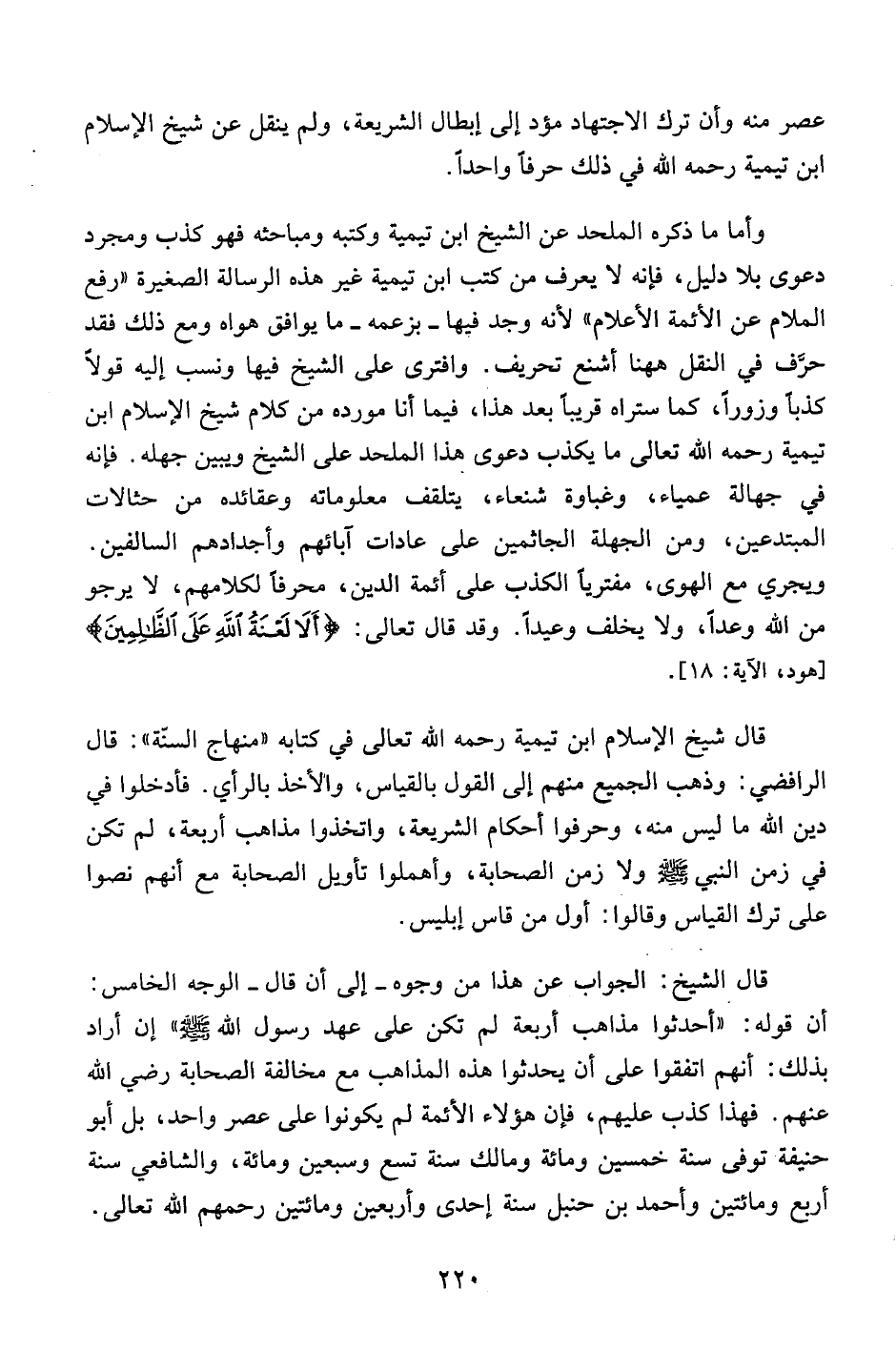 وأما ما ذكره الملحد عن الشيخ ابن تيمية وكتبه ومباحثه فهو كذب ومجرد دعوى بلا دليل، فإنه لا يعرف من كتب ابن تيمية غير هذه الرسالة الصغيرة "رفع الملام عن الأئمة الأعلام" لأنه وجد فيها -بزعمه- ما يوافق هواه ومع ذلك فقد حرف في النقل ههنا أشنع تحريف. وافترى على الشيخ فيها ونسب إليه قولاً كذباً وزوراً، كما سنراه قريباً بعد هذا، فيما أنا مورده من كلام شيخ الإسلام ابن تيمية رحمه الله تعالى ما يكذب دعوى هذا الملحد على الشيخ ويبين جهله. فإنه في جهالة عمياء، وغباوة شنعاء، يتلقف معلوماته وعقائده من حثالات المبتدعين، ومن الجهلة الجاثمين على عادات آبائهم وأجدادهم السالفين. ويجري مع الهوى، مفترياً الكذب على أئمة الدين، محرفاً لكلامهم، لا يرجو من الله وعداً، ولا يخلف وعيداً. وقد قال تعالى: {أَلا لَعْنَةُ اللَّهِ عَلَى الظَّالِمِينَ} [هود، الآية:18] .