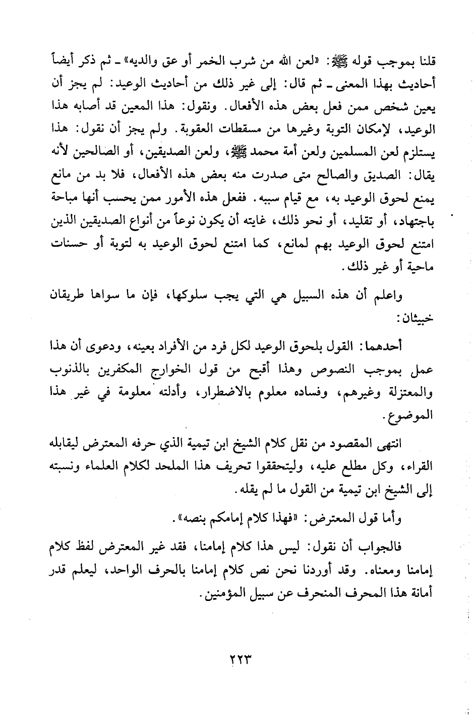 أحدهما: القول بلحوق الوعيد لكل فرد من الأفراد بعينه، ودعوى أن هذا عمل بموجب النصوص وهذا أقبح من قول الخوارج المكفرين بالذنوب والمعتزلة وغيرهم، وفساده معلوم بالاضطرار، وأدلته معلومة في غير هذا الموضوع.
