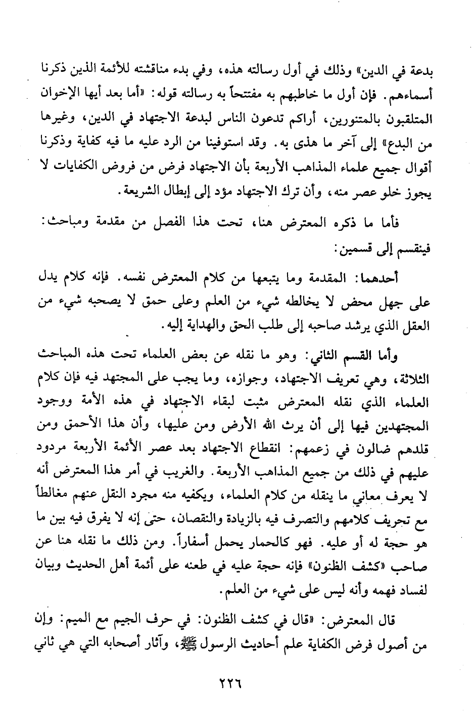 وأما القسم الثاني: وهو ما نقله عن بعض العلماء تحت هذه المباحث الثلاثة، وهي تعريف الاجتهاد، وجوازه، وما يجب على المجتهد فيه فإن كلام العلماء الذي نقله المعترض مثبت لبقاء الاجتهاد في هذه الأمة ووجود المجتهدين فيها إلى أن يرث الله الأرض ومن عليها، وأن هذا الأحمق ومن قلدهم ضالون في زعمهم: انقطاع الاجتهاد بعد عصر الأئمة الأربعة مردود عليهم في ذلك من جميع المذاهب الأربعة. والغريب في أمر هذا المعترض أنه لا يعرف معاني ما ينقله من كلام العلماء، ويكفيه منه مجرد النقل عنهم مغالطاً مع تحريف كلامهم والتصرف فيه بالزيادة والنقصان، حتى إنه لا يفرق فيه بين ما هو حجة له أو عليه. فهو كالحمار يحمل أسفاراً. ومن ذلك ما نقله هنا عن صاحب "كشف الظنون" فإنه حجة عليه في طعنه على أئمة أهل الحديث وبيان لفساد فهمه وأنه ليس على شيء من العلم.