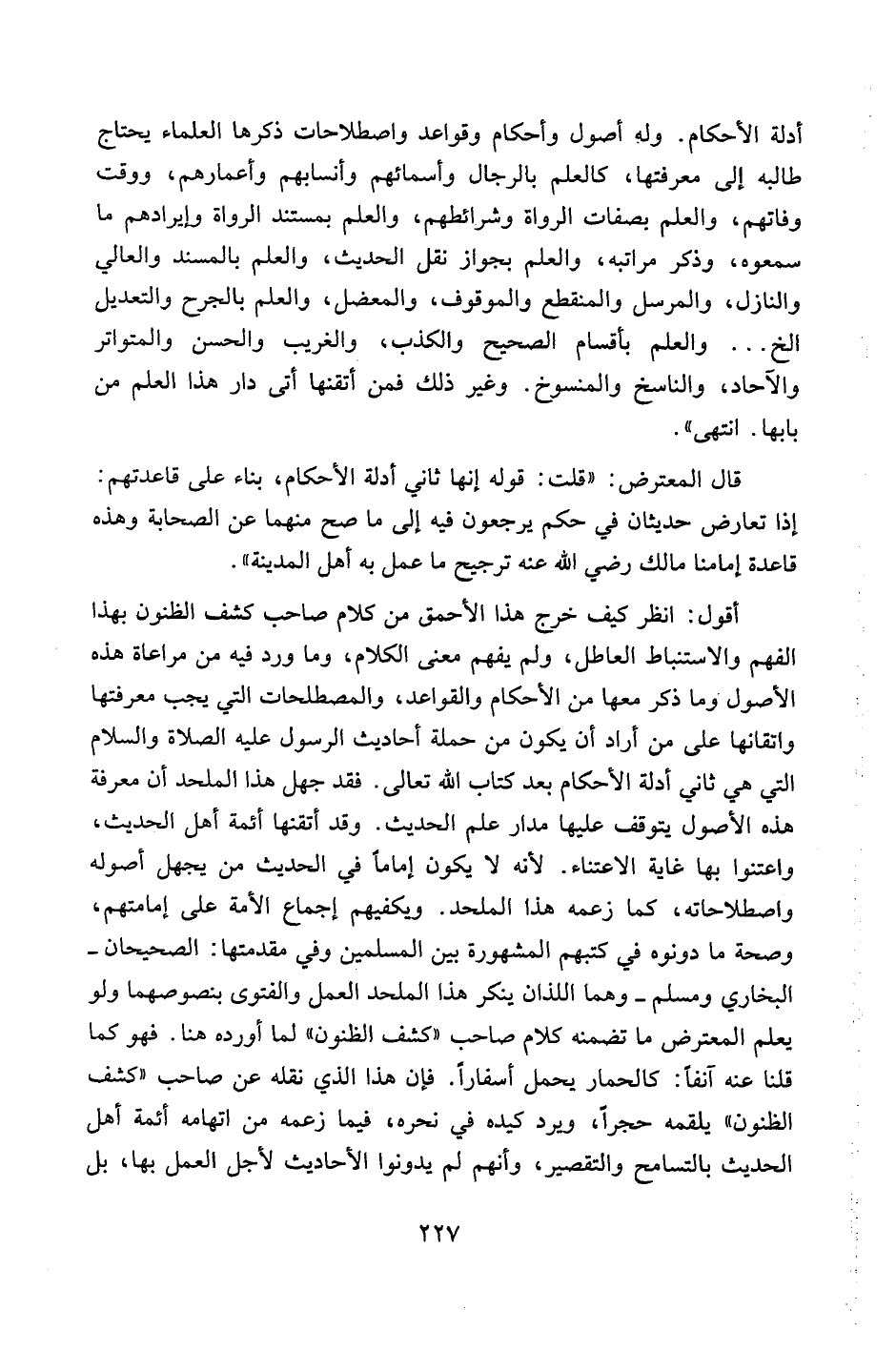أقول: انظر كيف خرج هذا الأحمق من كلام صاحب كشف الظنون بهذا الفهم والاستنباط العاطل، ولم يفهم معنى الكلام، وما ورد فيه من مراعاة هذه الأصول وما ذكر معها من الأحكام والقواعد، والمصطلحات التي يجب معرفتها واتقانها على من أراد أن يكون من حملة أحاديث الرسول عليه الصلاة والسلام التي هي ثاني أدلة الأحكام بعد كتاب الله تعالى. فقد جهل هذا الملحد أن معرفة هذه الأصول يتوقف عليها مدار علم الحديث. وقد أتقنها أئمة أهل الحديث، واعتنوا بها غاية الاعتناء. لأنه لا يكون إماماً في الحديث من يجهل أصوله واصطلاحاته، كما زعمه هذا الملحد. ويكفيهم إجماع الأمة على إمامتهم، وصحة ما دونوه في كتبهم المشهورة بين المسلمين وفي مقدمتها: الصحيحان – البخاري ومسلم – وهما اللذان ينكر هذا الملحد العمل والفتوى بنصوصهما ولو يعلم المعترض ما تضمنه كلام صاحب "كشف الظنون" لما أورده هنا. فهو كما قلنا عنه آنفاً: كالحمار يحمل أسفاراً. فإن هذا الذي نقله عن صاحب "كشف الظنون" يلقمه حجراً، ويرد كيده في نحره، فيما زعمه من اتهامه أئمة أهل الحديث بالتسامح والتقصير، وأنهم لم يدونوا الأحاديث لأجل العمل بها، بل