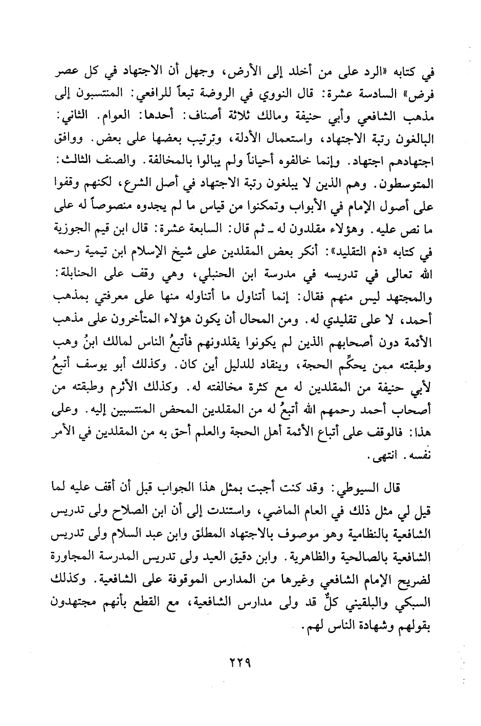 في كتابه "الرد على من أخلد إلى الأرض، وجهل أن الاجتهاد في كل عصر فرض" السادسة عشرة: قال النووي في الروضة تبعاً للرافعي: المنتسبون إلى مذهب الشافعي وأبي حنيفة ومالك ثلاثة أصناف: أحدها: العوام. الثاني: البالغون رتبة الاجتهاد، واستعمال الأدلة، وترتيب بعضها على بعض. ووافق اجتهادهم اجتهاد. وإنما خالفوه أحياناً ولم يبالوا بالمخالفة. والصنف الثالث: المتوسطون. وهم الذين لا يبلغون رتبة الاجتهاد في أصل الشرع، لكنهم وقفوا على أصول الإمام في الأبواب وتمكنوا من قياس ما لم يجدوه منصوصاً له على ما نص عليه. وهؤلاء مقلدون له – ثم قال: السابعة عشرة: قال ابن قيم الجوزية في كتابه "ذم التقليد": أنكر بعض المقلدين على شيخ الإسلام ابن تيمية رحمه الله تعالى في تدريسه في مدرسة ابن الحنبلي، وهي وقف على الحنابلة: والمجتهد ليس منهم فقال: إنما أتناول ما أتناوله منها على معرفتي بمذهب أحمد، لا على تقليدي له. ومن المحال أن يكون هؤلاء المتأخرون على مذهب الأئمة دون أصحابهم الذين لم يكونوا يقلدونهم فأتبع الناس لمالك ابن وهب وطبقته ممن يحكم الحجة، وينقاد للدليل أين كان. وكذلك أبو يوسف أتبع لأبي حنيفة من المقلدين له مع كثرة مخالفته له. وكذلك الأثرم وطبقته من أصحاب أحمد رحمهم الله أتبع له من المقلدين المحض المنتسبين إليه. وعلى هذا: فالوقف على أتباع الأئمة أهل الحجة والعلم أحق به من المقلدين في الأمر نفسه. انتهى.