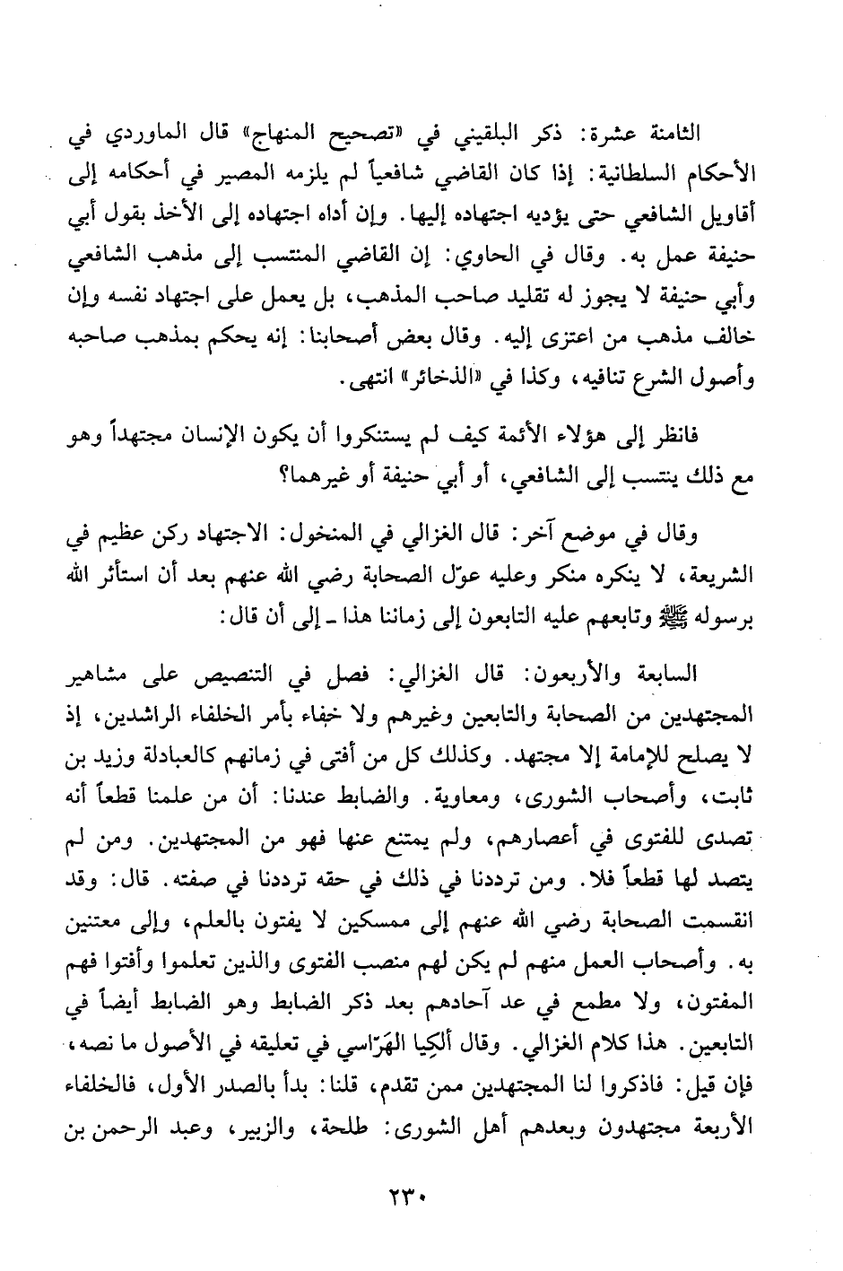 وقال في موضع آخر: قال الغزالي في المنخول: الاجتهاد ركن عظيم في الشريعة، لا ينكره منكر وعليه عول الصحابة رضي الله عنهم بعد أن استأثر الله برسوله صلى الله عليه وسلم وتابعهم عليه التابعون إلى زماننا هذا – إلى أن قال:
