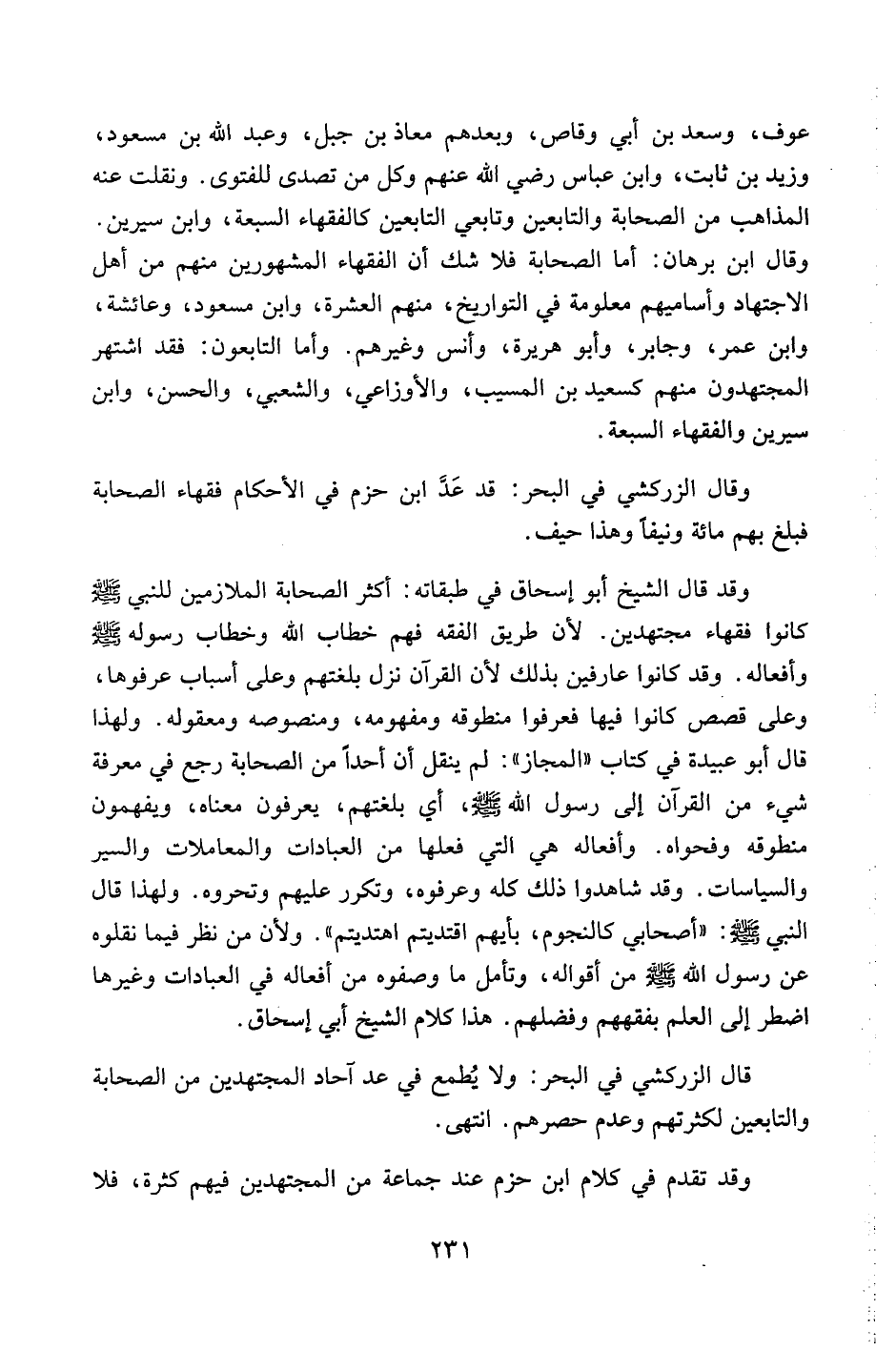 وقد قال الشيخ أبو إسحاق في طبقاته: أكثر الصحابة الملازمين للنبي صلى الله عليه وسلم كانوا فقهاء مجتهدين. لأن طريق الفقهاء فهم خطاب الله وخطاب رسوله صلى الله عليه وسلم وأفعاله. وقد كانوا عارفين بذلك لأن القرآن نزل بلغتهم وعلى أسباب عرفوها، وعلى قصص كانوا فيها فعرفوا منطوقه ومفهومه، ومنصوصه ومعقوله. ولهذا قال أبو عبيدة في كتاب "المجاز" لم ينقل أن أحداً من الصحابة رجع في معرفة شيء من القرآن إلى رسول الله صلى الله عليه وسلم، أي بلغتهم، يعرفون معناه، ويفهمون منطوقه وفحواه. وأفعاله هي التي فعلها من العبادات والمعاملات والسير والسياسات. وقد شاهدوا ذلك كله وعرفوه، وتكرر عليهم وتحروه. ولهذا قال النبي صلى الله عليه وسلم: "أصحابي كالنجوم، بأبيهم اقتديتم اهتديتم". ولأن من نظر فيما نقلوه عن رسول الله صلى الله عليه وسلم من أقواله، وتأمل ما وصفوه من أفعاله في العبادات وغيرها اضطر إلى العلم بفقههم وفضلهم. هذا كلام الشيخ أبي إسحاق.