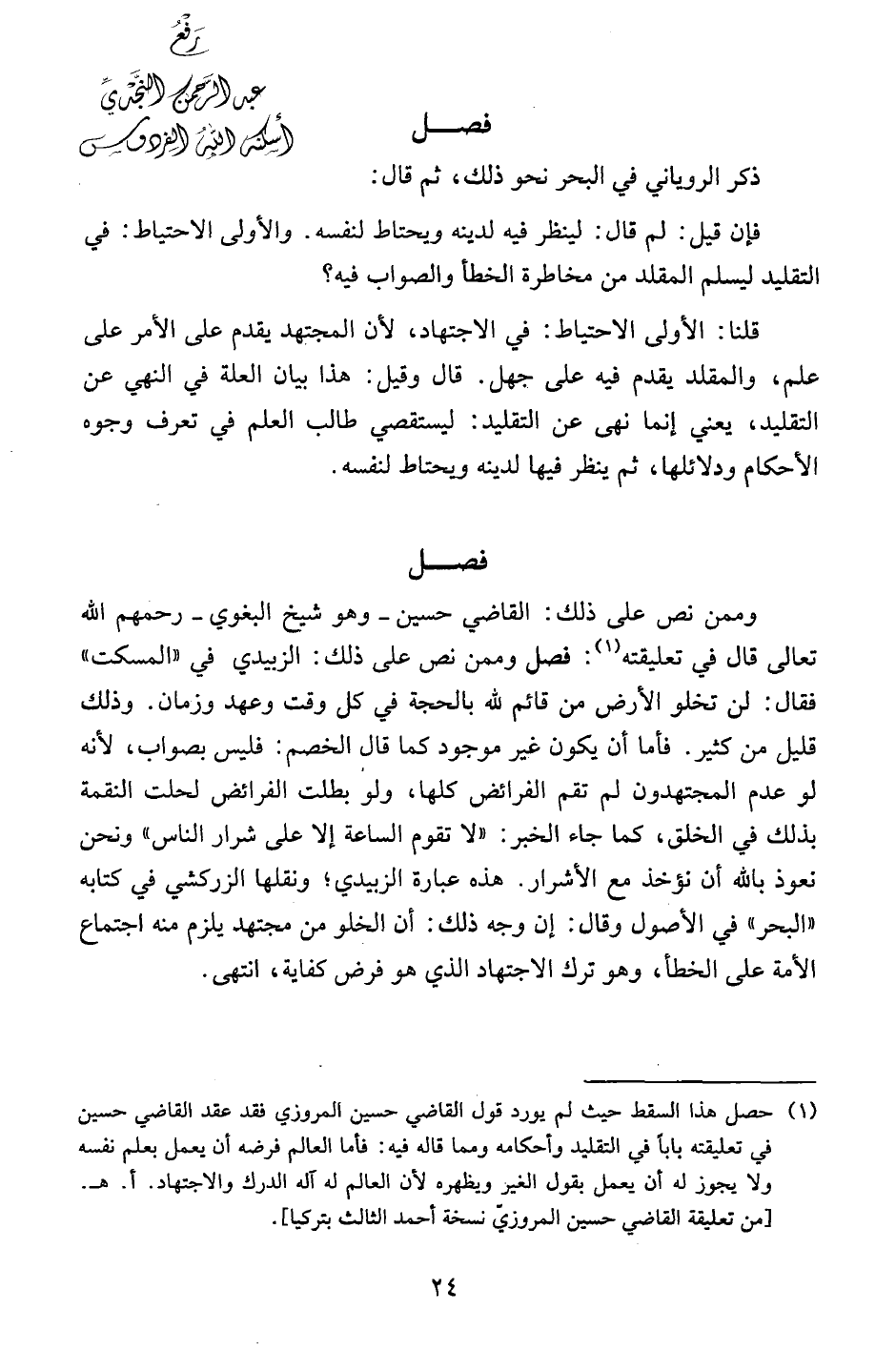 (1) حصل هذا السقط حيث لم يورد قول القاضي حسين المروزي فقد عقد القاضي حسين في تعليقته باباً في التقليد وأحكامه ومما قاله فيه: فأما العالم فرضه أن يعمل بعلم نفسه ولا يجوز له أن يعمل بقول الغير ويظهره لأن العالم له آله الدرك والاجتهاد. أ. هـ. [من تعليقة القاضي حسين المروزي نسخة أحمد الثالث بتركيا] .