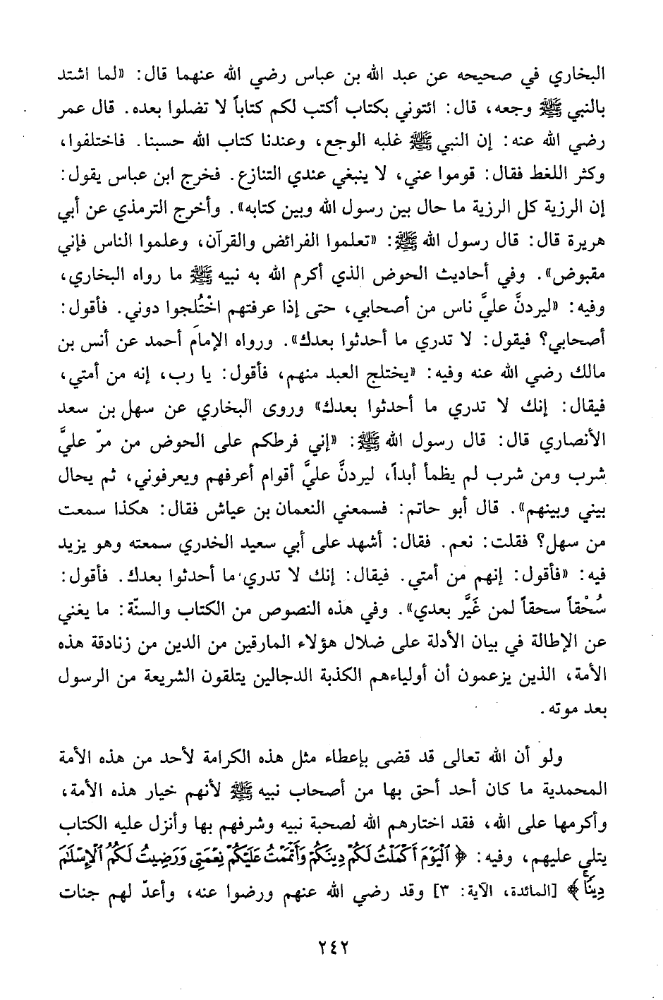 البخاري في صحيحه عن عبد الله بن عباس رضي الله عنهما قال: "لما اشتد بالنبي صلى الله عليه وسلم وجعه، قال:ائتوني بكتاب أكتب لكم كتاباً لا تضلوا بعده. قال عمر رضي الله عنه: إن النبي صلى الله عليه وسلم غلبه الوجع، وعندنا كتاب الله حسبنا. فاختلفوا، وكثر اللغط فقال: قوموا عني، لا ينبغي عندي التنازع. فخرج ابن عباس يقول: إن الرزية كل الرزية ما حال بين رسول الله وبين كتابه". وأخرج الترمذي عن أبي هريرة قال: قال رسول الله صلى الله عليه وسلم: "تعلموا الفرائض والقرآن، وعلموا الناس فإني مقبوض". وفي أحاديث الحوض الذي أكرم الله به نبيه صلى الله عليه وسلم ما رواه البخاري، وفيه: "ليردن علي ناس من أصحابي، حتى إذا عرفتم اختلجوا دوني. فأقول: أصحابي؟ فيقول: لا تدري ما أحدثوا بعدك". ورواه الإمام أحمد عن أنس بن مالك رضي الله عنه وفيه: "يختلج العبد منهم، فأقول: يا رب، إنه من أمتي، فيقال: إنك لا تدري ما أحدثوا بعدك" وروى البخاري عن سهل بن سعد الأنصاري قال: قال رسول الله صلى الله عليه وسلم: "إني فرطكم على الحوض من مر علي شرب ومن شرب لم يظمأ أبداً، ليردن علي أقوام أعرفهم ويعرفوني، ثم يحال بيني وبينهم". قال أبو حاتم: فسمعني النعمان بن عياش فقال: هكذا سمعت من سهل؟ فقلت: نعم. فقال: أشهد على أبي سعيد الخدري سمعته وهو يزيد فيه: "فأقول: إنهم من أمتي. فيقال: إنك لا تدري ما أحدثوا بعدك. فأقول: سحقاً سحقاً لمن غير بعدي". وفي هذه النصوص من الكتاب والسنة: ما يغني عن الإطالة في بيان الأدلة على ضلال هؤلاء المارقين من الدين من زنادقة هذه الأمة، الذين يزعمون أن أولياءهم الكذبة الدجالين يتلقون الشريعة من الرسول بعد موته.