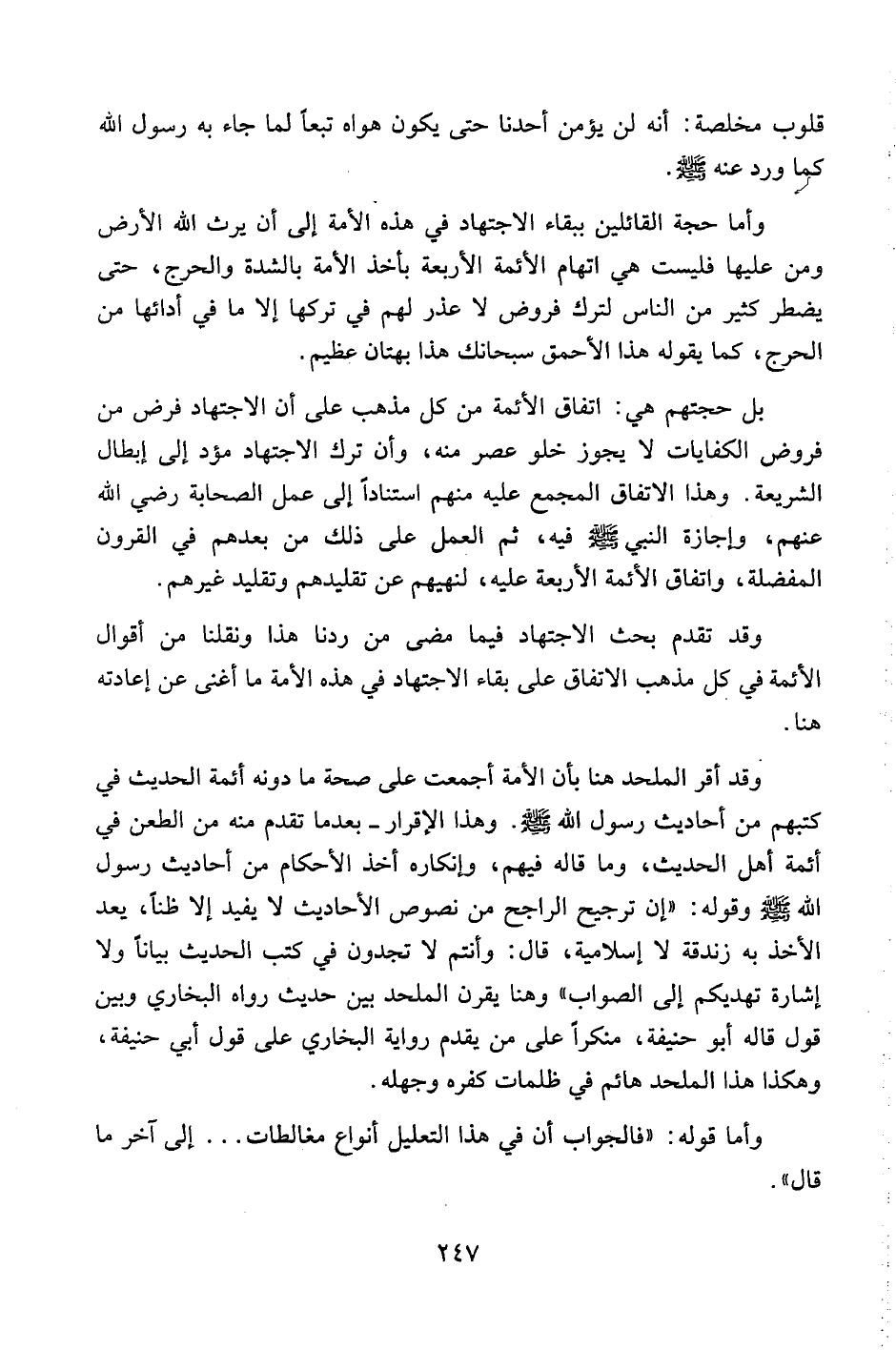 وأما حجة القائلين ببقاء الاجتهاد في هذه الأمة إلى أن يرث الله الأرض ومن عليها فليست هي اتهام الأئمة الأربعة بأخذ الأمة بالشدة والحرج، حتى يضطر كثير من الناس لترك فروض لا عذر لهم في تركها إلى ما في أدائها من الحرج، كما يقوله هذا الأحمق سبحانك هذا بهتان عظيم.