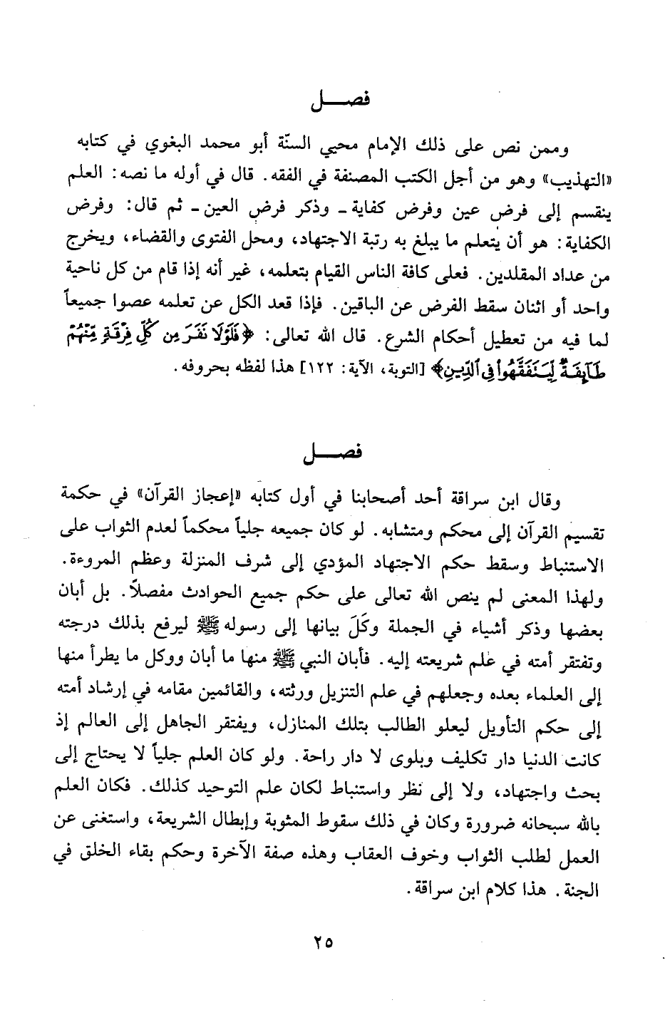 وممن نص على ذلك الإمام محيي السنة أبو محمد البغوي في كتابه "التهذيب" وهو من أجل الكتب المصنفة في الفقه. قال في أوله ما نصه: العلم ينقسم إلى فرض عين وفرض كفاية – وذكر فرض العين – ثم قال: وفرض الكفاية: هو أن يتعلم ما يبلغ به رتبة الاجتهاد، ومحل الفتوى والقضاء، ويخرج من عداد المقلدين. فعلى كافة الناس القيام بتعلمه، غير أنه إذا قام من كل ناحية واحد أو اثنان سقط الفرض عن الباقين. فإذا قعد الكل عن تعلمه عصوا جميعاً لما فيه من تعطيل أحكام الشرع. قال الله تعالى: {فَلَوْلا نَفَرَ مِنْ كُلِّ فِرْقَةٍ مِنْهُمْ طَائِفَةٌ لِيَتَفَقَّهُوا فِي الدِّينِ وَلِيُنْذِرُوا قَوْمَهُمْ إِذَا رَجَعُوا إِلَيْهِمْ لَعَلَّهُمْ يَحْذَرُونَ} [التوبة، الآية: 122] هذا لفظه بحروفه.