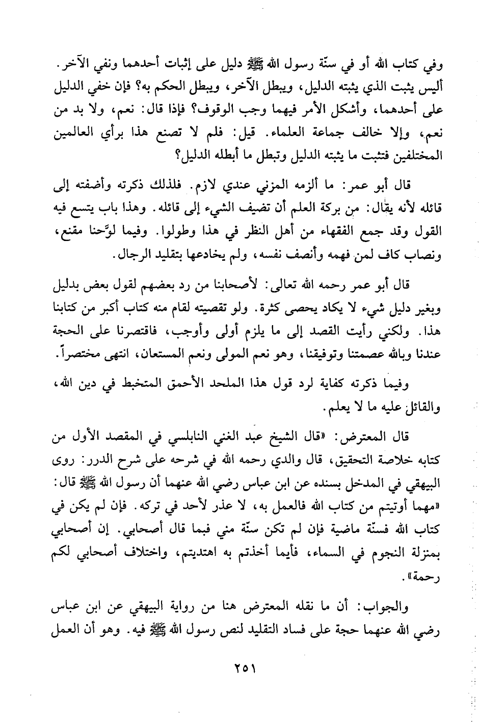 قال المعترض: "قال الشيخ عبد الغني النابلسي في المقصد الأول من كتابه خلاصة التحقيق، قال والدي رحمه الله في شرحه على شرح الدرر: روى البيهقي في المدخل بسنده عن ابن عباس رضي الله عنهما أن رسول الله صلى الله عليه وسلم قال: "مهما أوتيتم من كتاب الله فالعمل به، لا عذر لأحد في تركه. فإن لم يكن في كتاب الله فسنة ماضية فإن لم تكن سنة مني فبما قال أصحابي. إن أصحابي بمنزلة النجوم في السماء، فأيما أخذتم به اهتديتم، واختلاف أصحابي لكم رحمة".