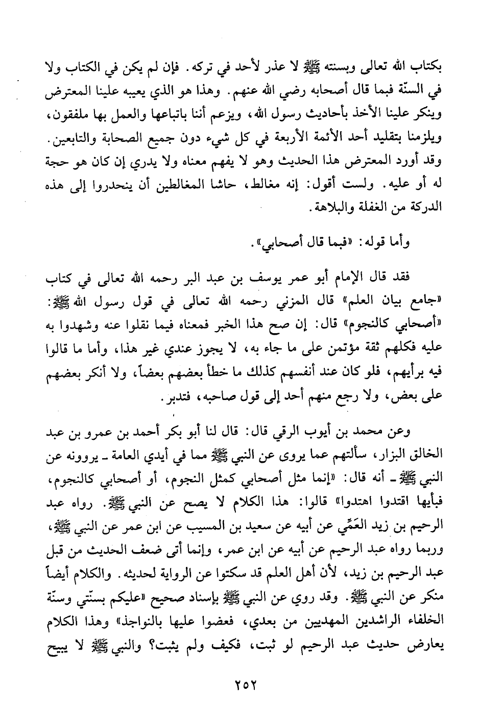وعن محمد بن أيوب الرقي قال: قال لنا أبو بكر أحمد بن عمرو بن عبد الخالق البزار، سألتهم عما يروى عن النبي صلى الله عليه وسلم مما في أيدي العامة – يروونه عن النبي صلى الله عليه وسلم – أنه قال: "إنما مثل أصحابي كمثل النجوم، أو أصحابي كالنجوم، فبأيها اقتدوا اهتدوا" قالوا: هذا الكلام لا يصح عن النبي صلى الله عليه وسلم. رواه عبد الرحيم بن زيد العمي عن أبيه عن سعيد بن المسيب عن ابن عمر عن النبي صلى الله عليه وسلم، وبما رواه عبد الرحيم عن أبيه عن ابن عمر، وإنما أتى ضعف الحديث من قبل عبد الرحيم بن زيد، لأهل العلم قد سكتوا عن الرواية لحديثه. والكلام أيضاً منكر عن النبي صلى الله عليه وسلم. وقد روي عن النبي صلى الله عليه وسلم بإسناد صحيح "عليكم بسنتي وسنة الخلفاء الراشدين المهديين من بعدي، فعضوا عليها بالنواجذ" وهذا الكلام يعارض حديث عبد الرحيم لو ثبت، فكيف ولم يثبت؟ والنبي صلى الله عليه وسلم لا يبيح